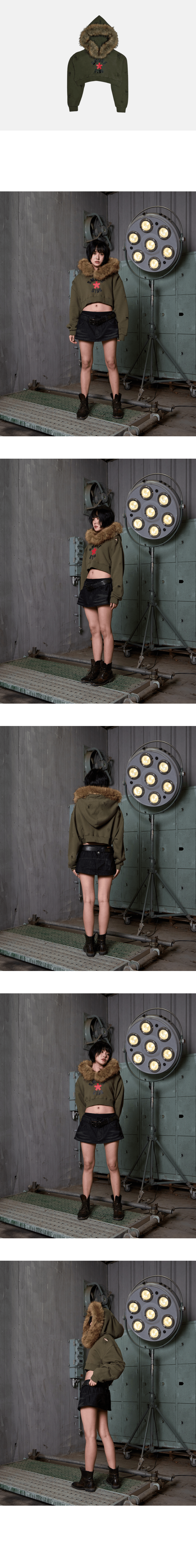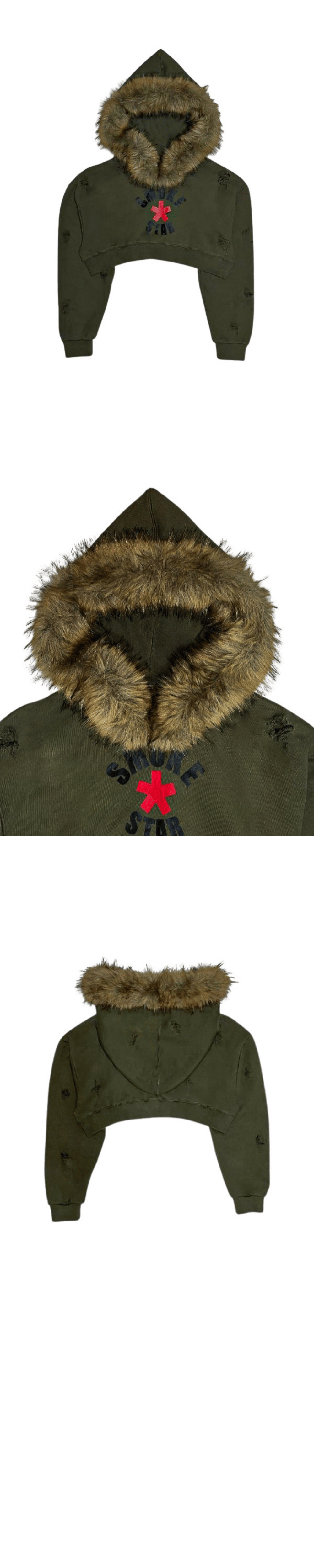 -우먼스 크롭 기장 -탈‧부착 퍼 트리밍 후드 -디스트로이드 데미지 워싱 -시그니처 로고 아트워크 - 오버사이즈 딥 후드 패턴