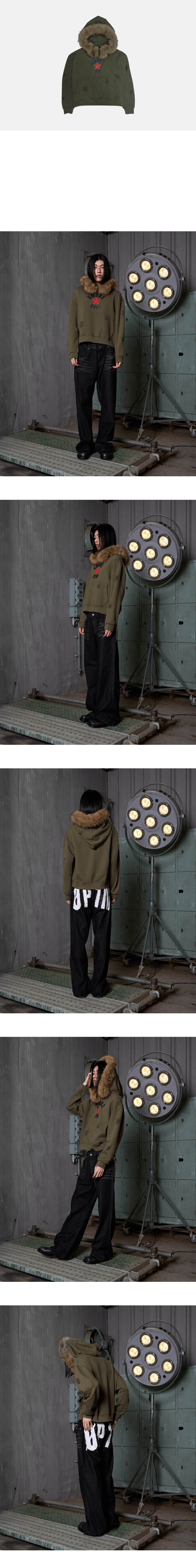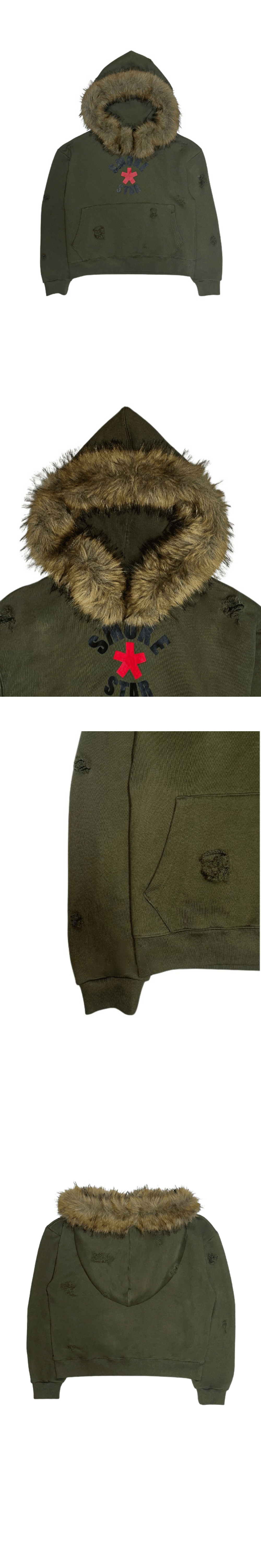 -탈‧부착 퍼 트리밍 후드 -디스트로이드 데미지 워싱 -시그니처 로고 아트워크 - 오버사이즈 딥 후드 패턴