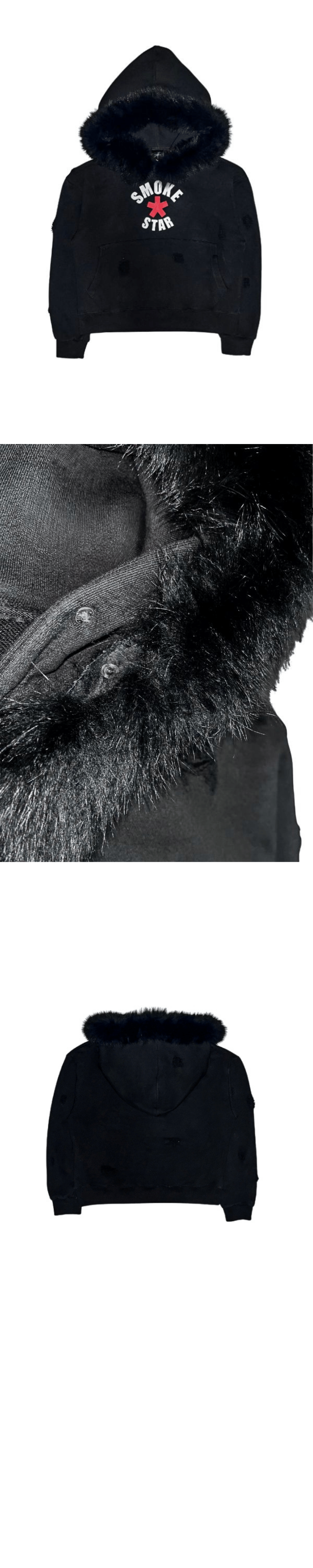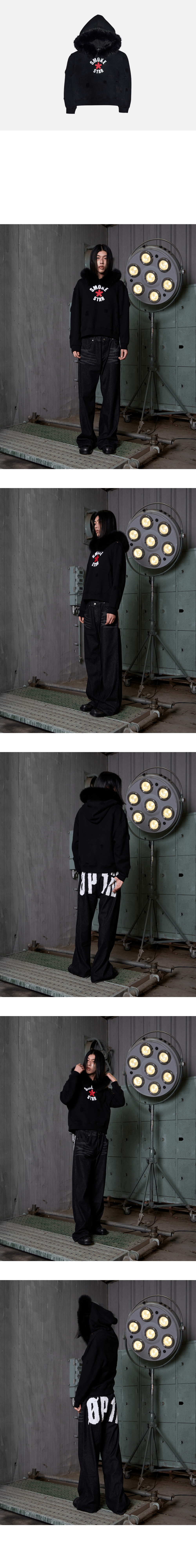 -탈‧부착 퍼 트리밍 후드 -디스트로이드 데미지 워싱 -시그니처 로고 아트워크 - 오버사이즈 딥 후드 패턴