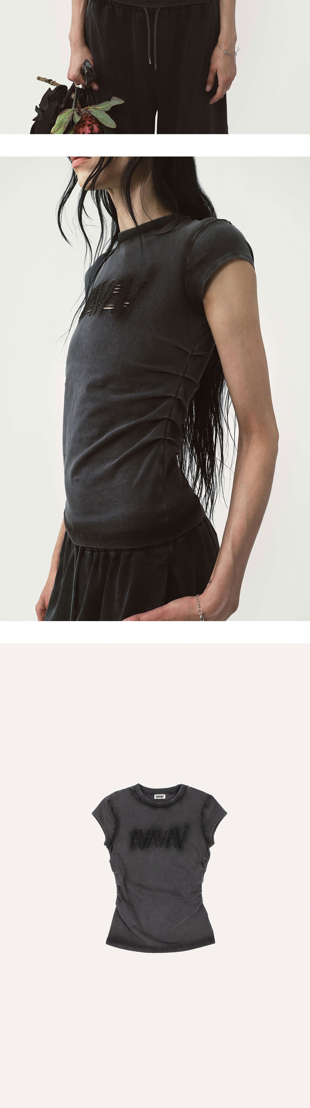 아바바브 우먼 베이비 티셔츠 컷 AV 로고 블랙입니다. - 가슴 중앙 컷아웃 로고 포인트 - 로고와 절개 주변의 다크 스프레이 디테일 - 측면 핀턱 디테일로 입체적인 실루엣 연출 - 코튼 져지 소재 - 슬림핏