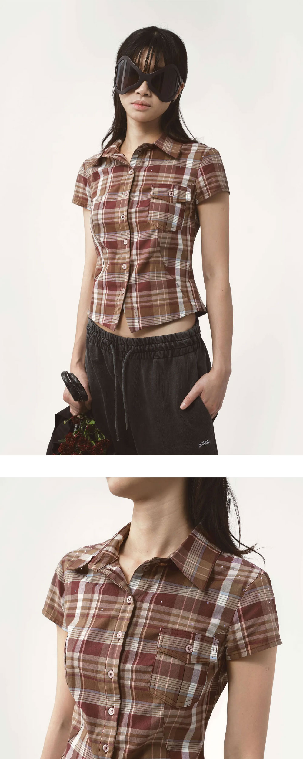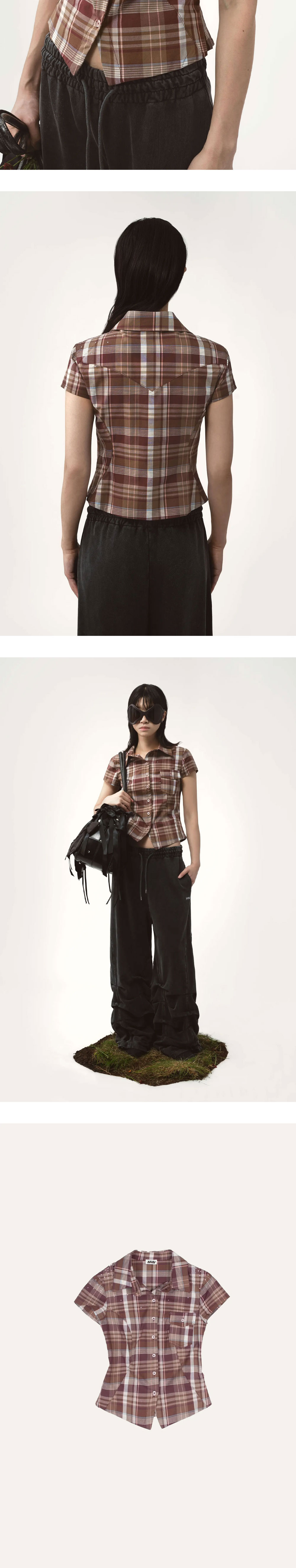 체크 패턴과 디테일한 장식이 어우러진 감각적인 디자인, 아바바브 우먼 셔츠 숏슬리브 브라운입니다. - 버튼업 프론트와 약간 곡선진 밑단 디자인 - 어깨와 전면에 라인스톤 아플리케 장식 디테일 - 일본 데드스탁 코튼 셔츠 원단으로 제작 - 슬림 핏 실루엣으로 몸에 맞는 착용감 제공