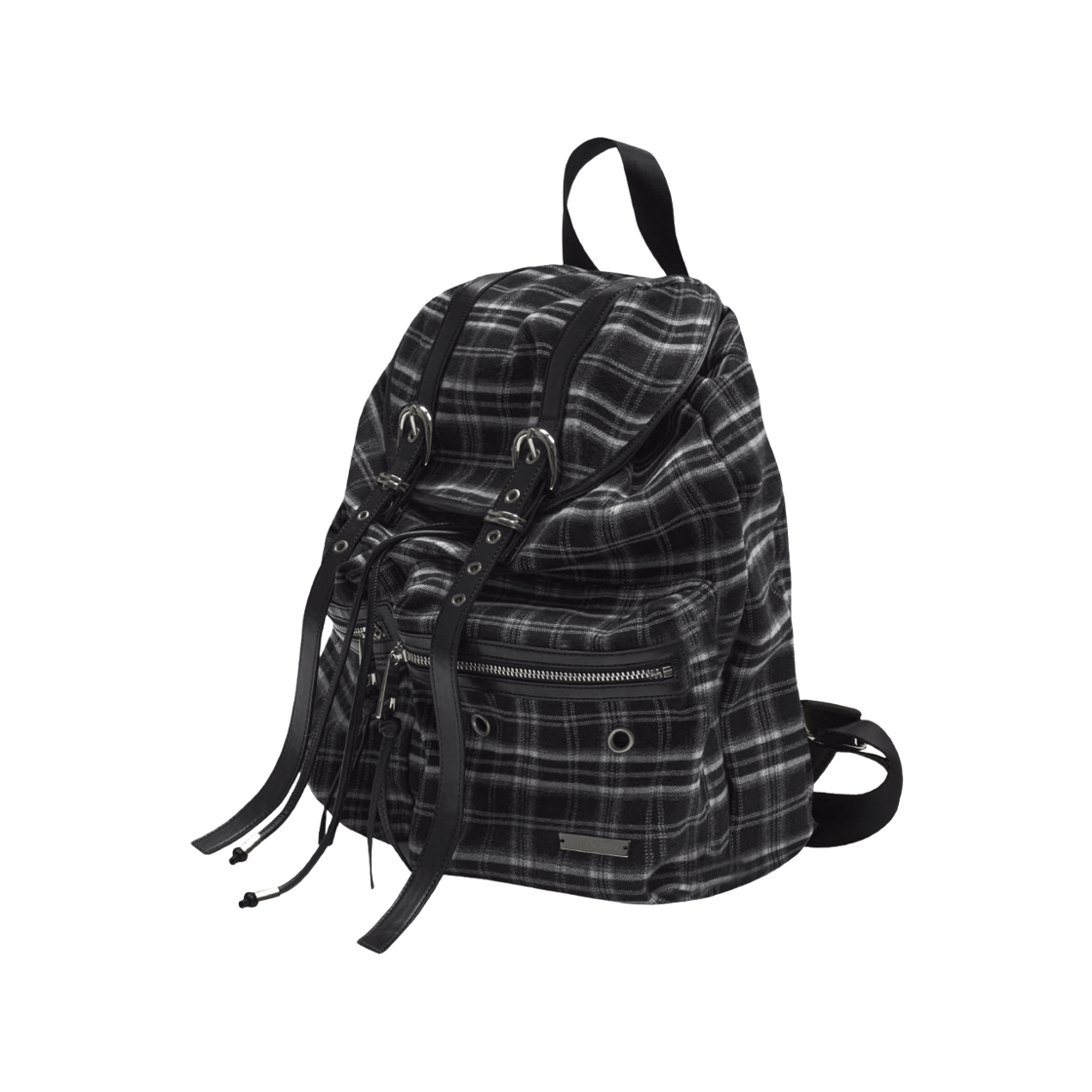 DESIGN SUMMARY ⦁ 체크 바디와 인조가죽 배색으로 제작된 모토(Moto) 모티브 백팩 백팩 플랩 양쪽에 길게 늘어지는 벨트 디테일이 포인트로, 벨트 밑부분 자석을 부착해 쉽게 열고 닫을수 있도록 디자인 아일렛 포인트와 메탈 지퍼 디테일의 낫노잉 시그니처 포켓을 하단에 2개 배치하여 편리한 수납. ⦁ 사이드 지퍼로 쉽게 수납할 수 있는 디테일 ⦁ 가방 뒷면에 브랜드 로고 각인 가죽 패치와 조절 가능한 나일론 위빙 숄더 스트랩 적용 ⦁ 11인치 패드 수납 가능 FABRIC 60% POLYESTER, 35% RAYON, 5% SPANDEX CARE ⦁ DRY CLEAN 권장 SIZE -HEIGHT : 32cm -WIDTH : 36cm -DEPTH : 10cm MODEL MODEL 1 : 175cm MODEL 2 : 170cm