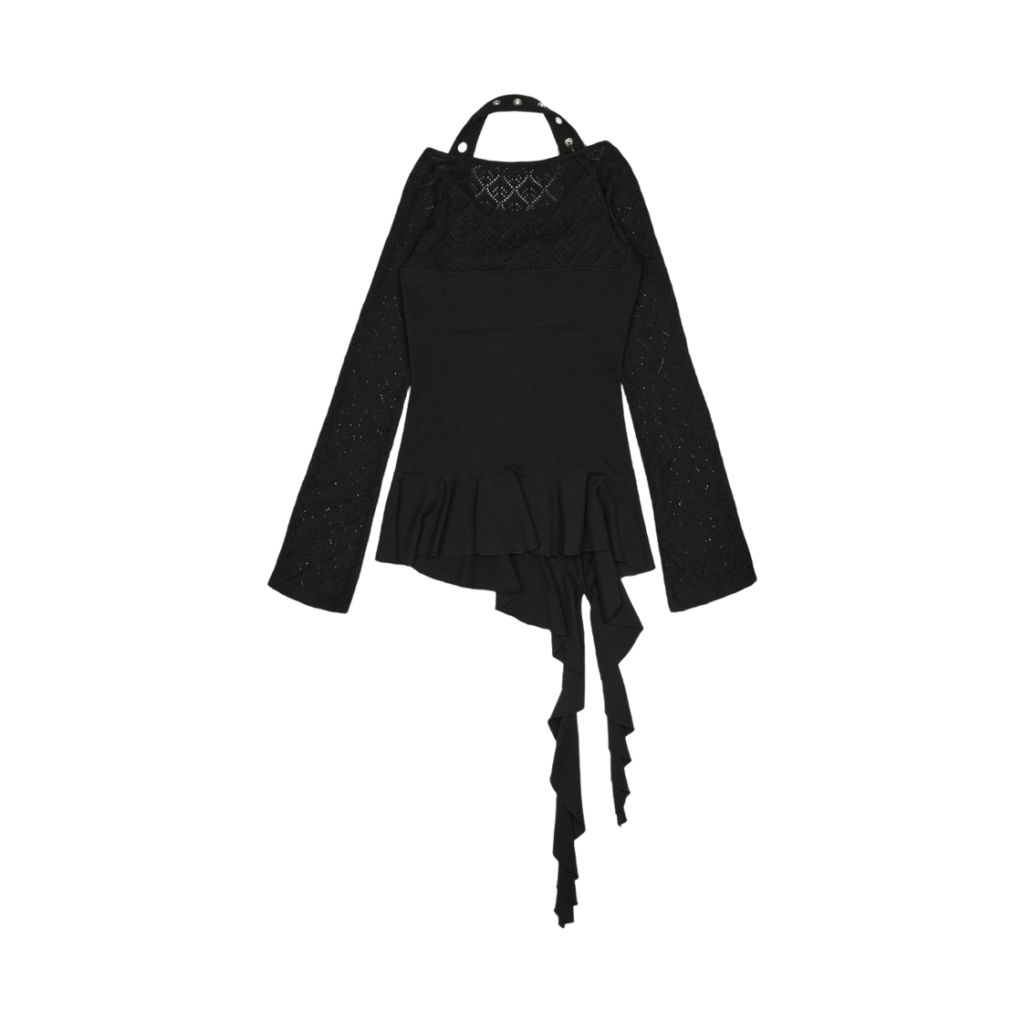 DESIGN SUMMARY ⦁ 스트레치 코튼 원단과 크로셰 니트 원단을 조합하여 제작된 비대칭 롱슬리브 탑 ⦁ 와이드 보트넥 디자인으로 원숄더 스타일 연출 가능 ⦁ 사이즈 조절이 가능한 벨트 버클 포인트의 홀터넥 디자인 ⦁ 비대칭으로 떨어지는 러플 라인이 포인트 FABRIC 95% COTTON, 5% SPANDEX CARE ⦁ DRY CLEAN 권장 SIZE -CHEST : 42cm -SLEEVE : 65cm -LENGTH(BACK) : 59cm MODEL MODEL 1 : 175cm MODEL 2 : 170cm