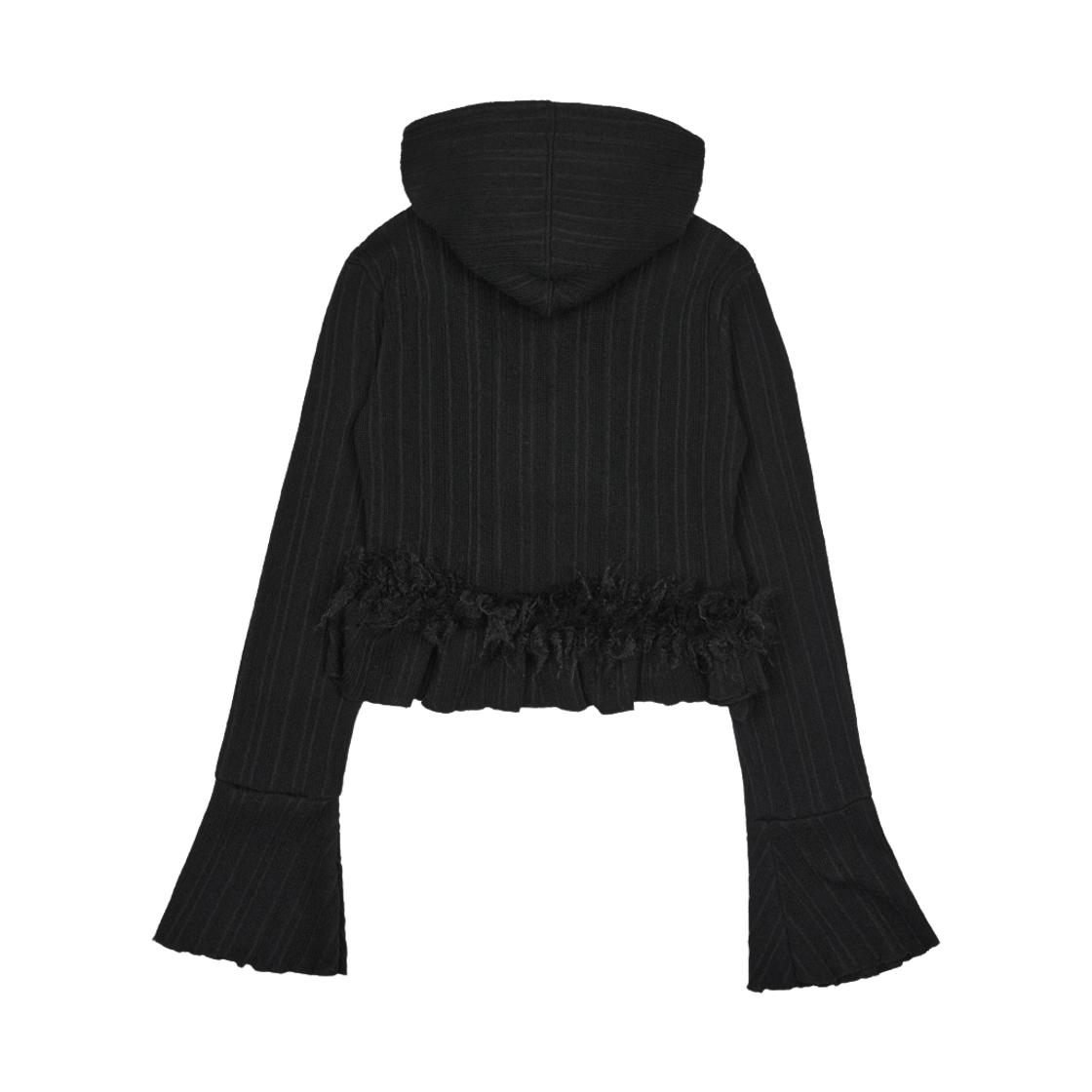 Grunge Fur Hood Cardigan (BLACK) DESIGN SUMMARY ⦁ 텍스쳐 있는 니트 원단으로 제작된 퍼 디테일 후드 가디건 ⦁ 그런지한 긴 기장감의 헤어리 퍼 트리밍이 전면부터 뒷면 러플라인을 따라 디자인 ⦁ 앞 중심 스트랩 끈으로 연출 가능 ⦁ 커브형 밑단 라인을 따라 이어지는 볼드한 러플 디테일 ⦁ 소매 끝단 와이드한 벨 소매 마무리 FABRIC 95% POLYESTER, 5% SPANDEX CARE ⦁ DRY CLEAN 권장 SIZE -SHOULDER : 40cm -CHEST : 42cm -SLEEVE : 68cm -LENGTH(BACK) : 47cm -BOTTOM : 40cm MODEL MODEL 1 : 175cm MODEL 2 : 170cm