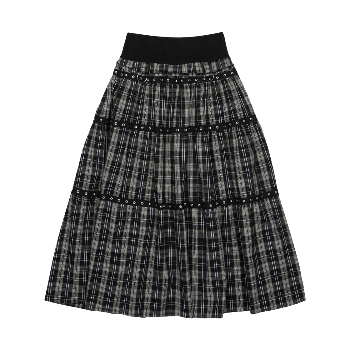 DESIGN SUMMARY ⦁ 멀티 체크 원단으로 제작된 티어드 롱 스커트 ⦁ 높은 폭의 허리 시보리, 앞뒤 O-링 벨트와 스트랩으로 포인트 강조 ⦁ 각 티어드 부분에 아일렛 테이프를 사용하여 청키한 무드 연출 ⦁ 스커트 내부 전체 안감 처리 FABRIC BODY : 100% COTTON LINING : 100% POLYESTER CARE ⦁ DRY CLEAN 권장 SIZE -WAIST : 33cm -HIP : 45cm -LENGTH : 84cm MODEL MODEL 1 : 175cm MODEL 2 : 170cm