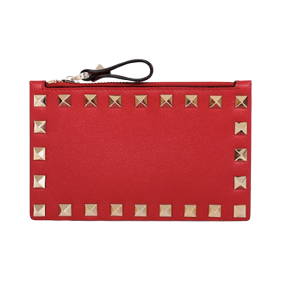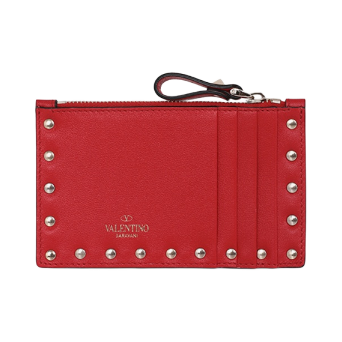 발렌티노 락스터드 카프스킨 지퍼 카드 홀더 루즈 퓌르
