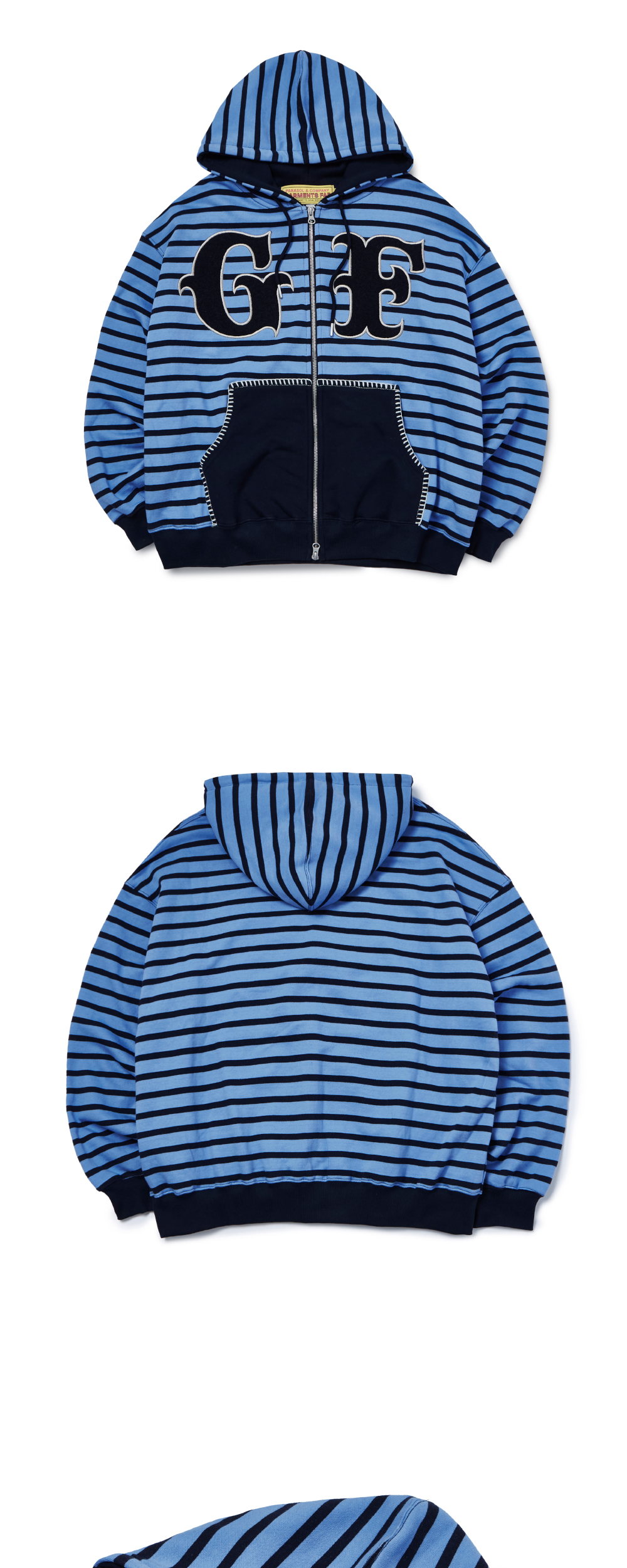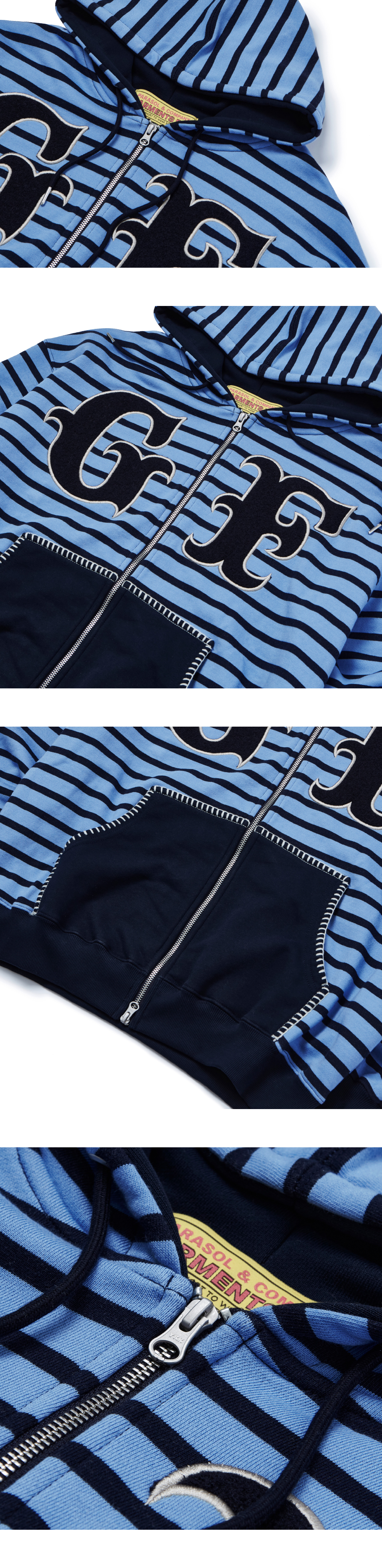 가먼츠팹 큰 덧댐 자수 줄무늬 후디 집업 블루