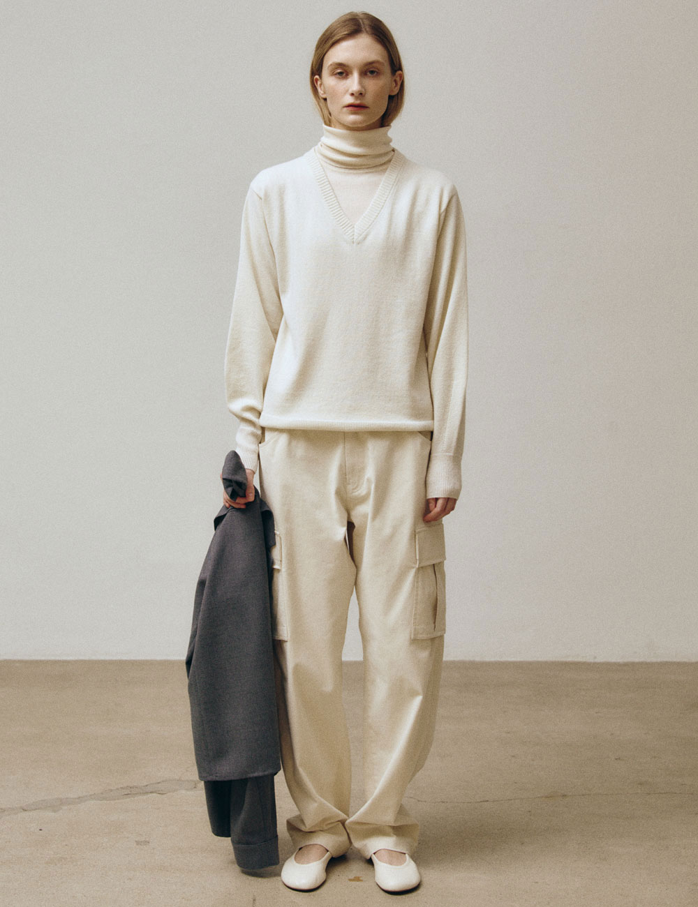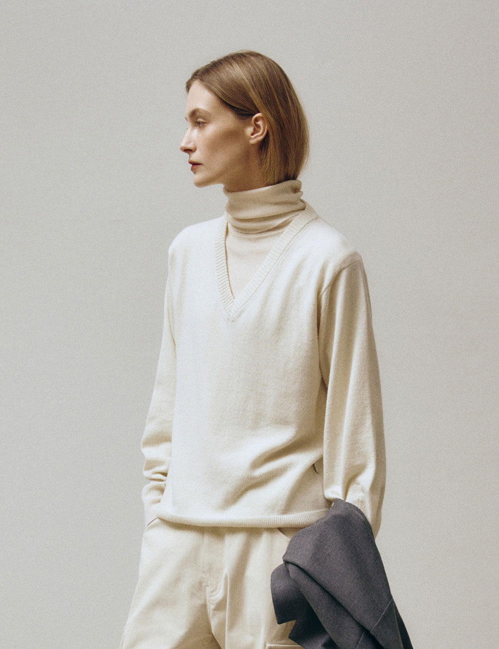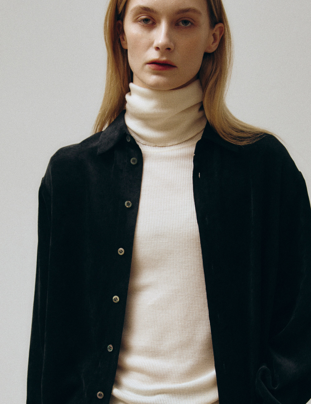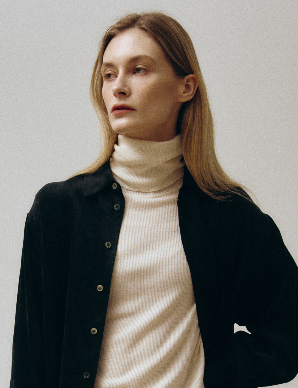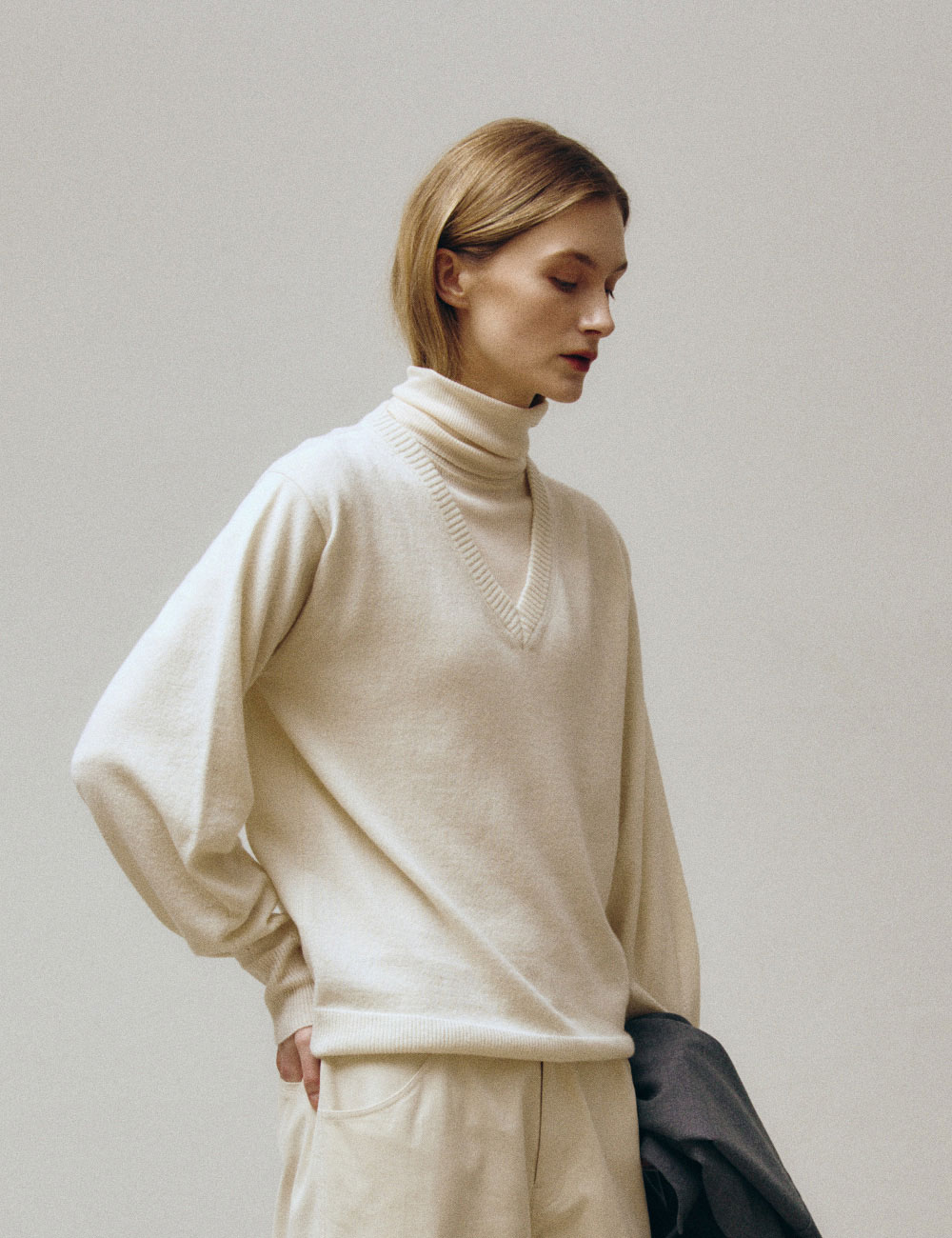 - 슬림핏의 폴딩 터틀넥 롱 슬리브 니트웨어 - 부드럽고 보온성이 우수한 해외 수입 울 골지 저지 - 커버스티치 디테일