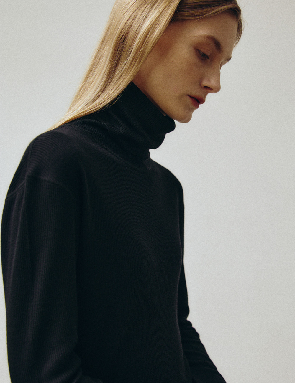 - 슬림핏의 폴딩 터틀넥 롱 슬리브 니트웨어 - 부드럽고 보온성이 우수한 해외 수입 울 골지 저지 - 커버스티치 디테일