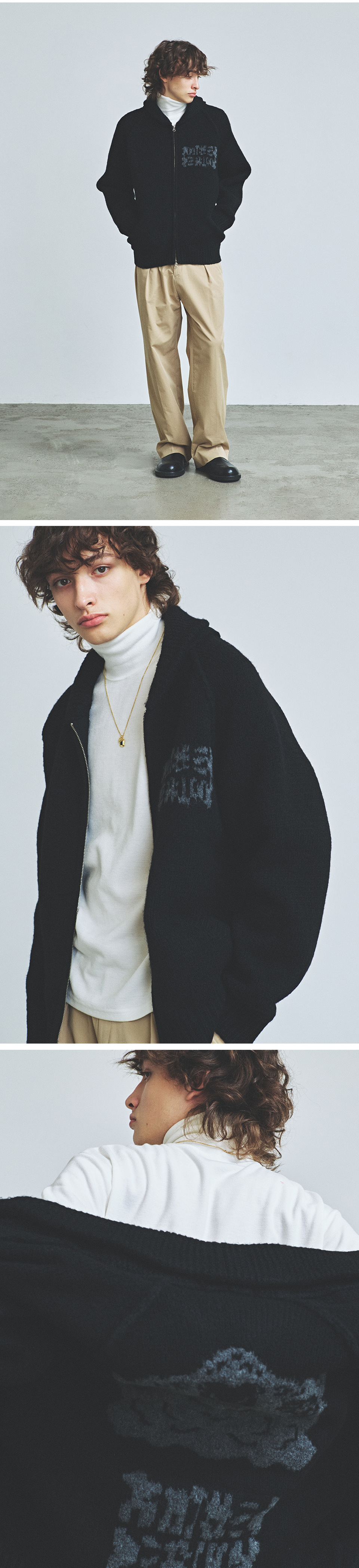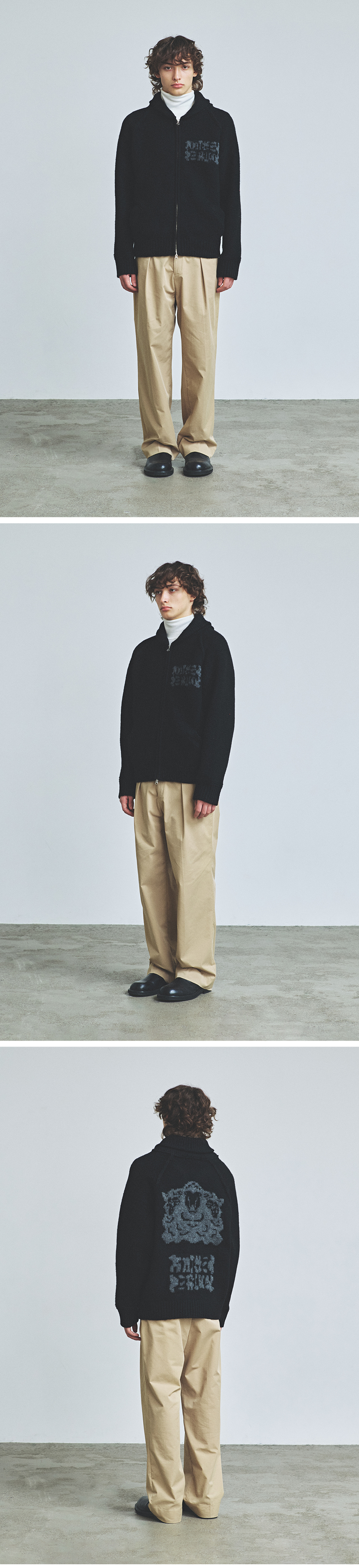 아티스트 Lowqual Theta의 개성 있는 아트워크가 더해져 트렌디하면서도 감각적인 디자인의 제품입니다. 두께감 있는 울 혼방 소재로 보온성이 뛰어나고 늘어나기 쉬운 립 부분은 탄탄하게 제작하였으며 투웨이 집업 디자인으로 오픈 클로징 방식에 따라 다양한 느낌으로 연출할 수 있어 활용도가 높습니다. 전후면의 아트워크 및 소매 배색 디자인으로 단독 착용만으로도 포인트가 되어주는 니트 집업입니다.