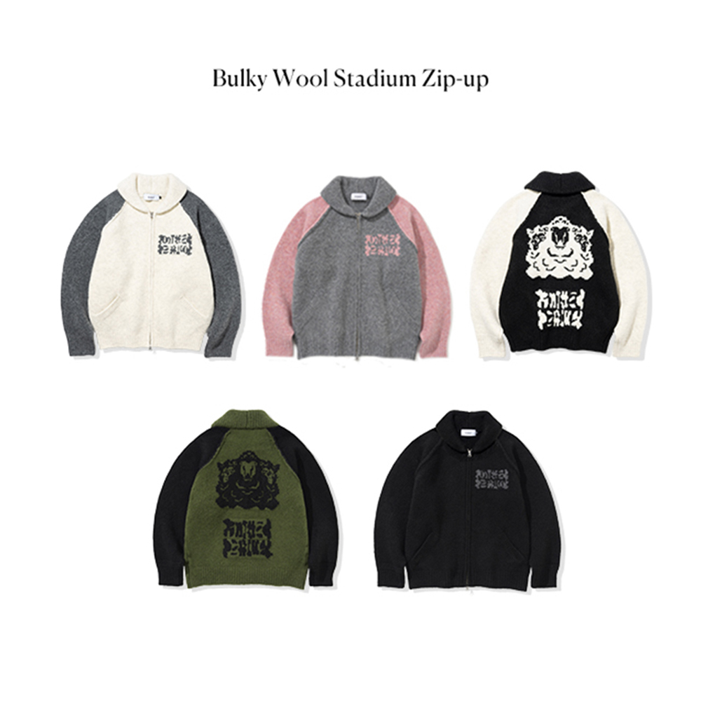 니티드 벌키 울 스타디움 집업 카키 블랙