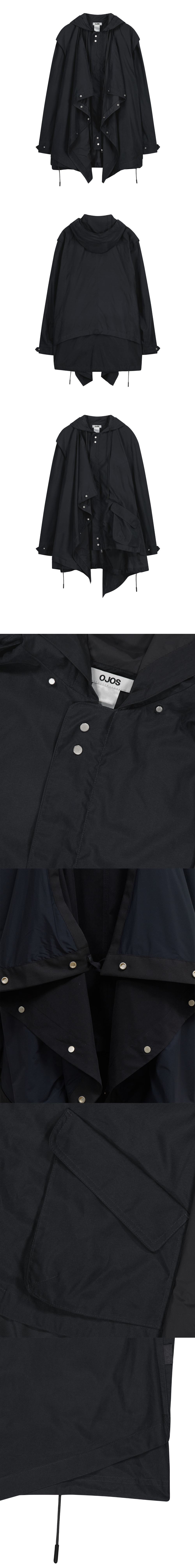 드레이핑 패널이 레이어드 된 오버핏 숏 야상자켓 | 오버 핏 | 가볍고 내구성 높은 폴리/나일론 소재 사용 | 전면 가슴 OJOS 로고 자수 | 앞여밈 플랩과 스냅버튼으로 다양한 방식의 드레이핑 연출 가능 | 여밈 방향 좌/우 구분없이 양쪽 모두 활용가능 | 밑단과 후드 스트링 | 커프스 사이즈 조절 디테일 | 패널 밑으로 숨겨진 독특한 구조의 사이드 포켓 | 착용 시 밀도높은 레이어드 실루엣과 볼륨감 있는 아웃핏 연출 | 사이드 OJOS 로고 라벨 포인트 | 전면에 YKK 2-way 니켈지퍼 및 폴러마감