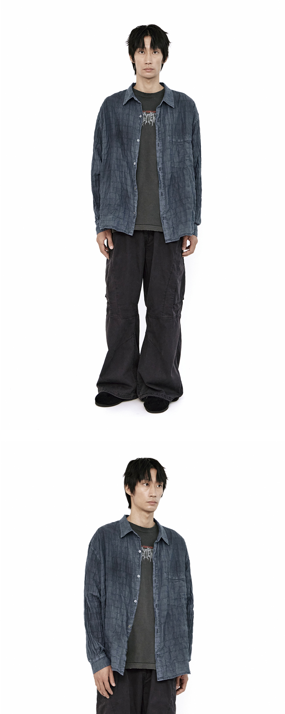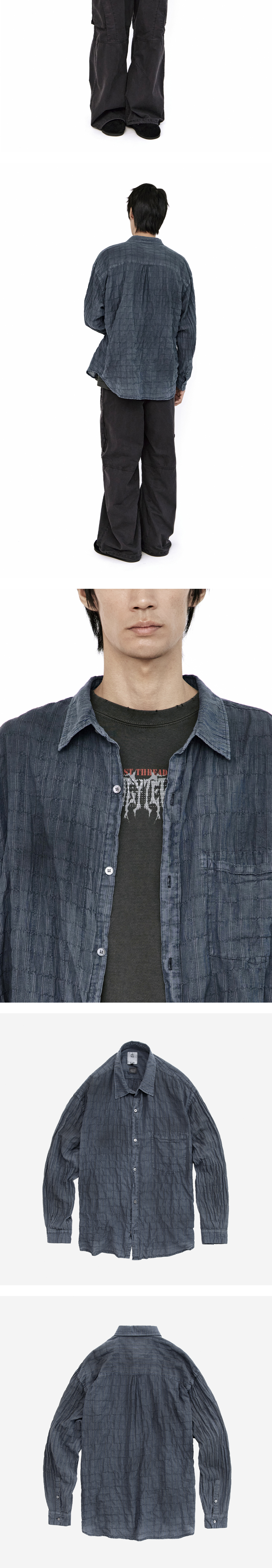 striped shirts dirty dyed (japanese fabric) - blue, purple gray - 불규칙적인 더티 가공이 특징적인 재패니즈 패브릭 셔츠 - 표면의 러프한 분위기와 대비되는 섬세하고 가벼운 소재감 - 가먼트 다잉 및 워싱을 통해 완성한 부드러운 터치감 - 어깨에서부터 자연스럽게 무너지는 쉐입 - 밀도감 있는 플리츠 & 퍼커링 디테일 - 자개 단추 적용 *모델: 170 중반 / 마른 체형, 3사이즈 착용