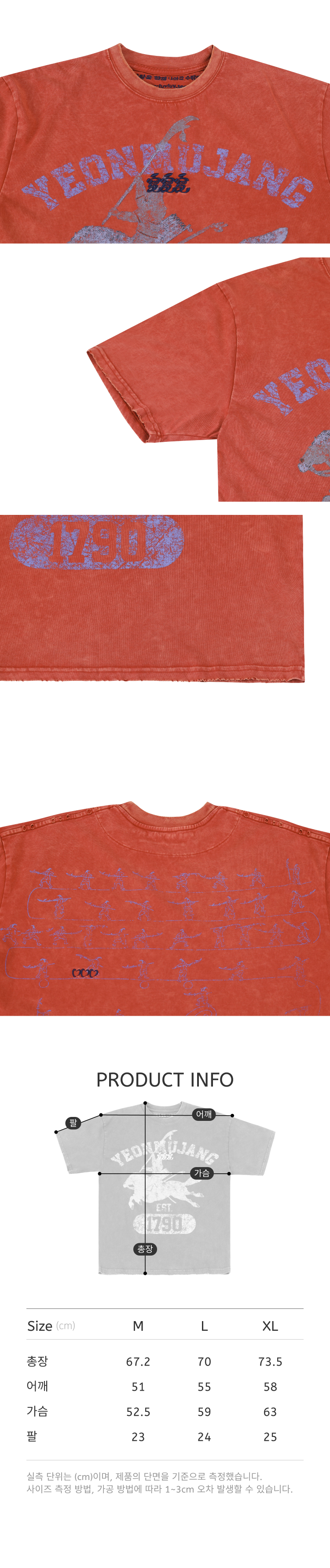 러브러브러브의 플래그십 스토어가 있는 서울 성수동 연무장길은 약 230년 전, 조선 정조 14년(1790)에 군인들이 무예를 닦던 역사 깊은 ‘연무장’입니다. 이 특별한 장소를 기리고자 티셔츠 전면에는 《무예도보통지》의 ‘마상월도’, 후면에는 월도 훈련 장면을 담은 고전 그림을 프린트해, 브랜드의 지역 정체성과 스토리를 자연스럽게 녹였습니다. 부드러운 촉감과 통기성이 뛰어난 코튼 소재에 빈티지한 느낌을 더한 디스트레스 처리 디테일과 워싱, 앞뒤에 추가된 자수 장식으로 고품질의 디테일을 제공합니다. 루즈핏에 살짝 짧은 기장감, 트렌디한 실루엣으로 만들아져 여름에 티셔츠 하나로 외출이 가능한 룩을 완성합니다.