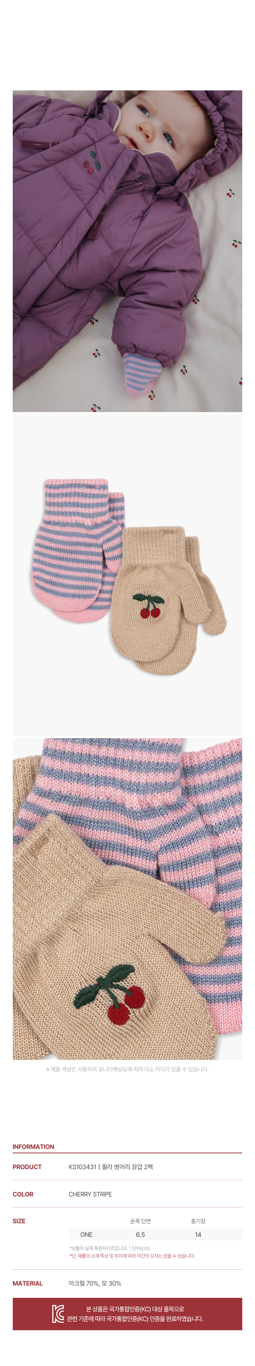 콩제슬래드 필라 벙어리 장갑 2팩 체리 스트라이프
