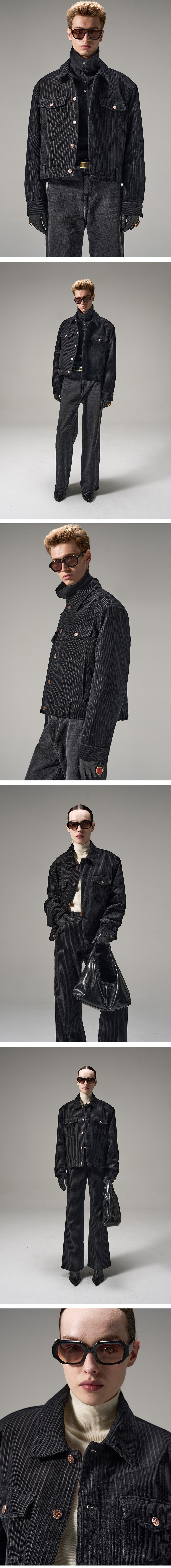 변형 코듀로이 조직감에 다이아 누빔안감을 더한 트러커 자켓입니다. 구조적인 어깨 실루엣이 특징과 아웃포켓 디테일이 특징입니다. M DISTORTED CORDUROY FLARED PANTS와 셋업으로 연출할 수 있습니다.