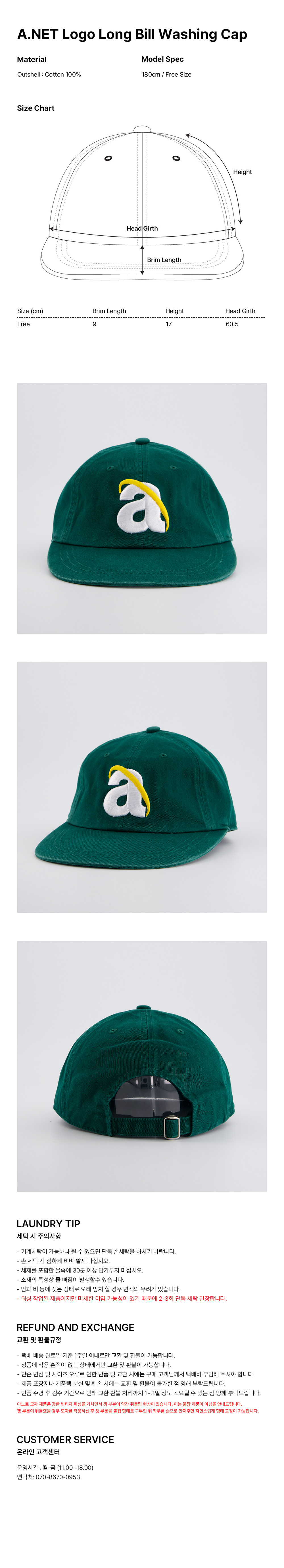 아노트 A.NET 로고 롱 빌 워싱 캡 그린