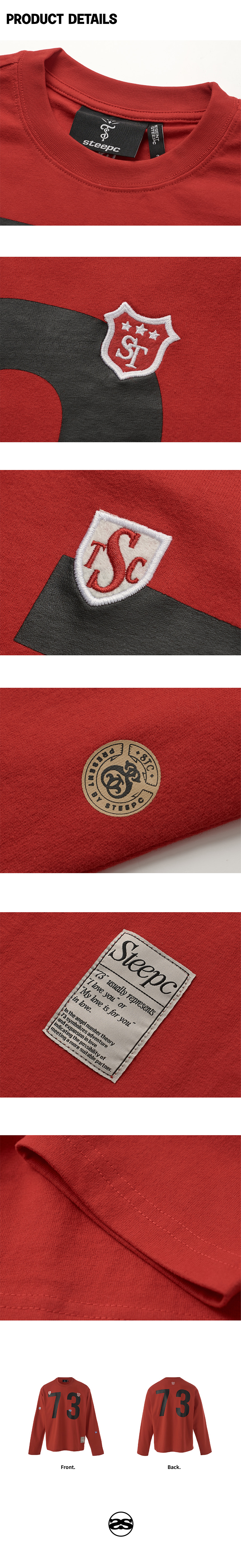 - 레드 컬러의 라운드넥 디자인 - 73 숫자 자수와 프린트 디테일 - 스티치가 강조된 빈티지 무드의 원단 사용