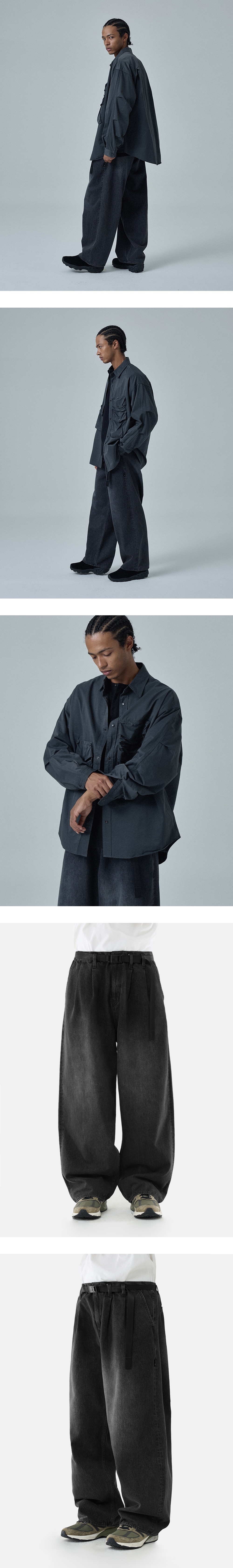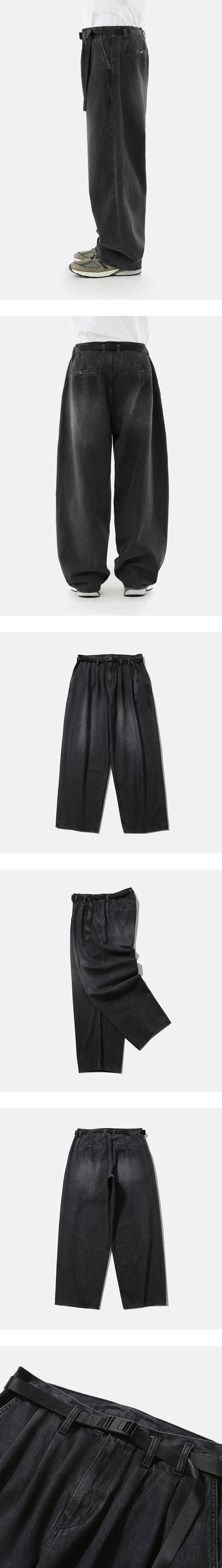 와이드 한 실루엣이 돋보이는 벨트가 달린 데님 팬츠 · 와이드 한 오버사이즈 실루엣. · 11온즈의 데님 원단 사용. · 자석이 부착된 버클을 사용한 탈부착이 가능한 벨트. · 허리 부분 턱과 다트를 넣어 편안한 착용감과 풍성한 실루엣 연출. · 지퍼 플라이 사양. · 스냅 버튼이 부착되어 있는 뒤 주머니 사양. · 사이드 심 부분 모이프 심볼 포인트 라벨 부착. *데님 직조 방법에 의해 아랫부분으로 갈수록 원단이 자연스럽게 뒤틀리는 현상이 있을 수 있습니다.