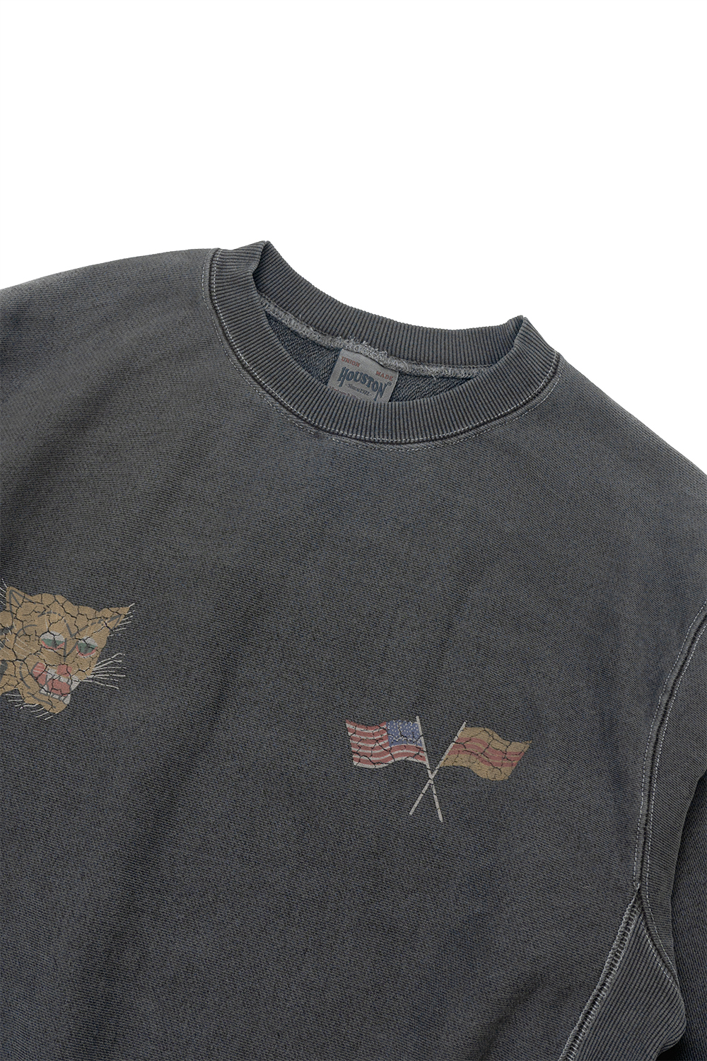 Houston Japan 22338 Pigment R/W Sweat Shirt (VIETNAM TIGER) - Black 14oz 의 코튼으로 제작한 리버스위브 스웨트 셔츠입니다. 피그먼트 다잉으로 빈티지함을 더했습니다. 가슴 양쪽과 뒷판에 베트남 자켓의 특징인 무늬를 빈티지한 크랙 프린팅한 것이 특징입니다. * Cotton 100% * 빛에 의한 제품의 색감 차이가 존재 할 수 있습니다. * Made in China