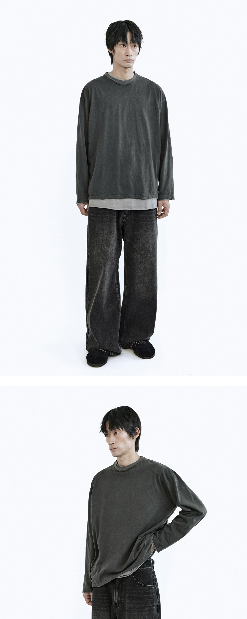 gosima denim pants - washed black 002 - 러프해보이는 겉 텍스쳐, 그와 상반되는 부드러운 피팅감 - 빈티지한 워싱감 - 고시마 팬츠의 디테일을 데님 팬츠에 적합하게 디벨롭 - 엔지니어드 팬츠 기반의 패턴 - 절제된 플레어드 실루엣 - 사이드 어드저스터 *모델: 170 중반 / 마른 체형, 3사이즈 착용 *기존 폴리테루 제품군과 동일 사이즈 권장 *일반 체형 기준 - 170cm 초반 이하 2사이즈 권장 - 170cm 중반 3사이즈 권장 - 170cm 후반~180cm 초반 4사이즈 권장