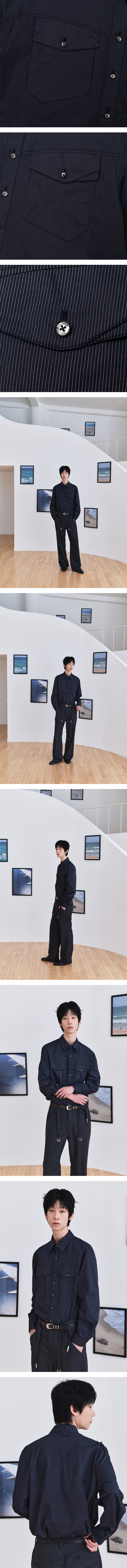 - 매력적인 텍스쳐의 스트라이프 패브릭 - 시크하고 섹시한 형태의 카라 라인감 - 내부 쌈솔 봉제 - 웨이비니스 로고 각인 단추 - 전면부 커브드한 절개라인 - 전면부 커브드한 디자인의 투포켓 셔츠 - 후면부 웨이비니스 시그니처 디테일 - Color Black / Blue / Navy -Outshell Blue Stripe - Cotton 100% Navy Stripe - Cotton 98% , Poly 2% Black Stripe - Cotton 76%, Nylon 21%, Span 3% - SIZE 1 : 어깨 50 가슴 57 소매 63 총장 67 2 : 어깨 52 가슴 59 소매 64 총장 68 3 : 어깨 54 가슴 61 소매 65 총장 69 MODEL 182cm 63kg 2SIZE 착용 184cm 68kg 2SIZE 착용 187cm 65kg 2SIZE 착용