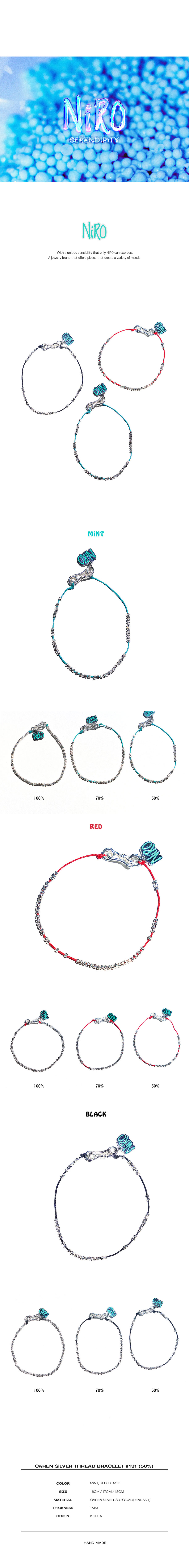 NiRO의 모든 제품은 핸드메이드로 주문 후 최대 10일 이내에 걸쳐 주문 제작됩니다. 카렌 실버와 실로 포인트를 준 팔찌입니다. 카렌 실버의 채움 정도가 100%, 70%, 50% 나눠져 있어 실이 보이는 정도를 취향에 맞추어 선택하실 수 있습니다. 여성 추천 사이즈 16CM 17CM 남성 추천 사이즈 18CM