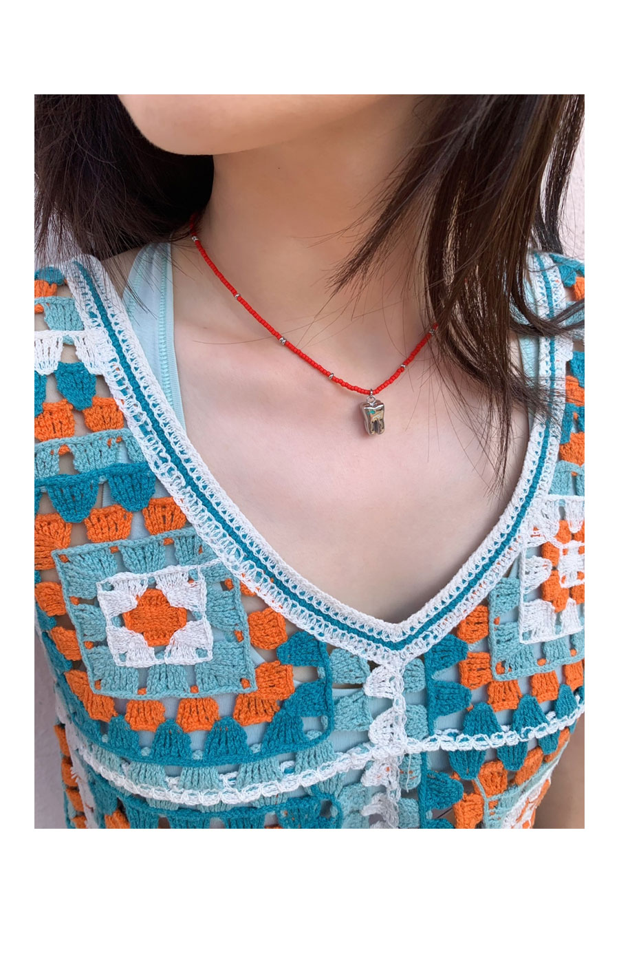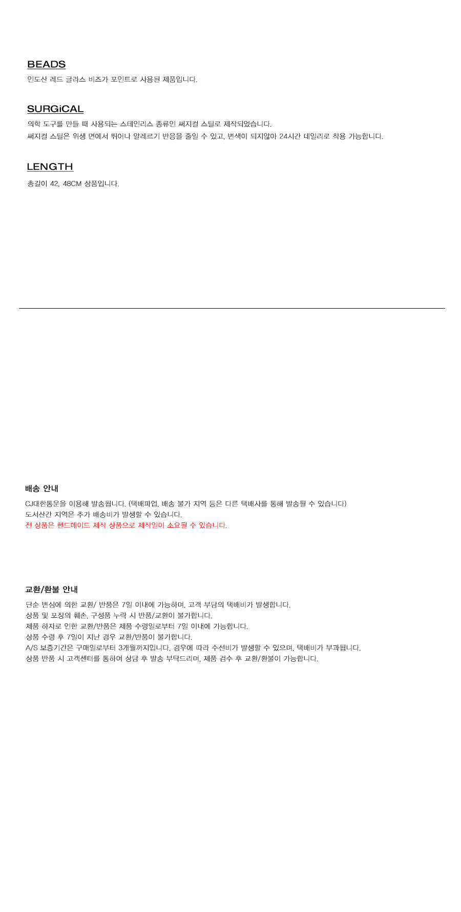 NiRO의 모든 제품은 핸드메이드로 주문 후 최대 10일 이내에 걸쳐 주문 제작됩니다. 레드 글라스 비즈와 써지컬 소재의 은볼이 들어간 스트랩과 니로의 어금니 참이 포인트인 목걸이입니다. 블루 비즈 디테일이 있습니다. 여성 추천 사이즈 42cm 남성 추천 사이즈 48cm