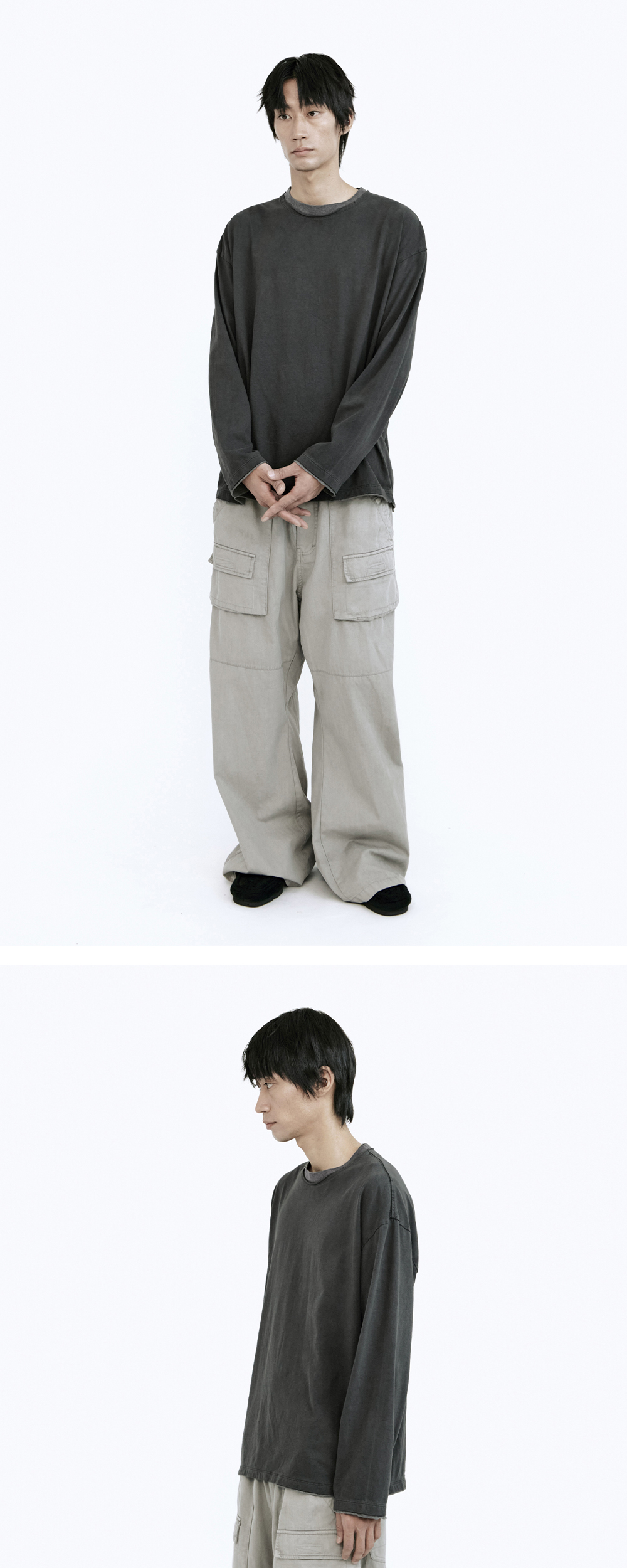 layered long sleeves - 2가지 컬러의 컷아웃 레이어링이 적용된 롱 슬리브 티셔츠 - 사용감이 강조되는 강한 워싱 가공 - 부드러운 터치감 & 필링감 - 후면 넥라인 ~ 어깨 체인스티치 마감 *모델: 170 중반, 마른 체형 / 3사이즈 착용 *금번 차수는 직전 차수 대비, 미세하게 어둡게 완성됐습니다.