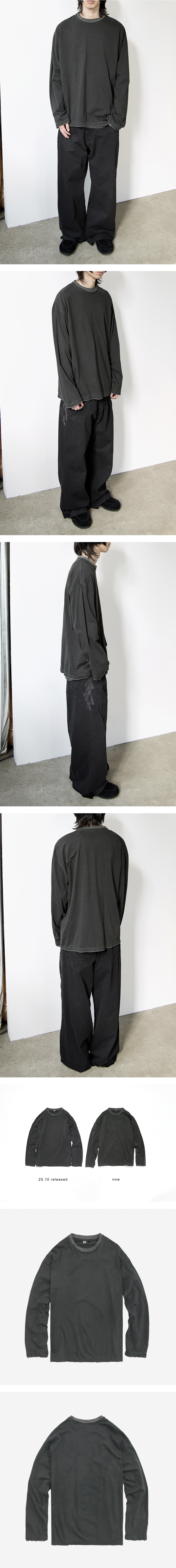 layered long sleeves - 2가지 컬러의 컷아웃 레이어링이 적용된 롱 슬리브 티셔츠 - 사용감이 강조되는 강한 워싱 가공 - 부드러운 터치감 & 필링감 - 후면 넥라인 ~ 어깨 체인스티치 마감 *모델: 178cm, 마른 체형 / 3사이즈 착용 *직전 차수 대비, 유사한 컬러감, 유사한 피팅감으로 제작되었습니다.