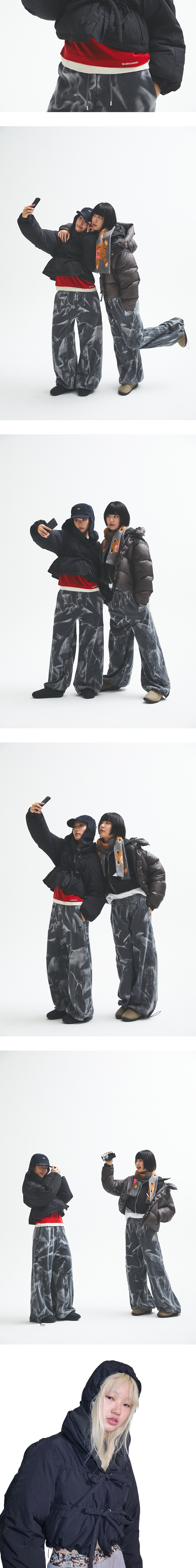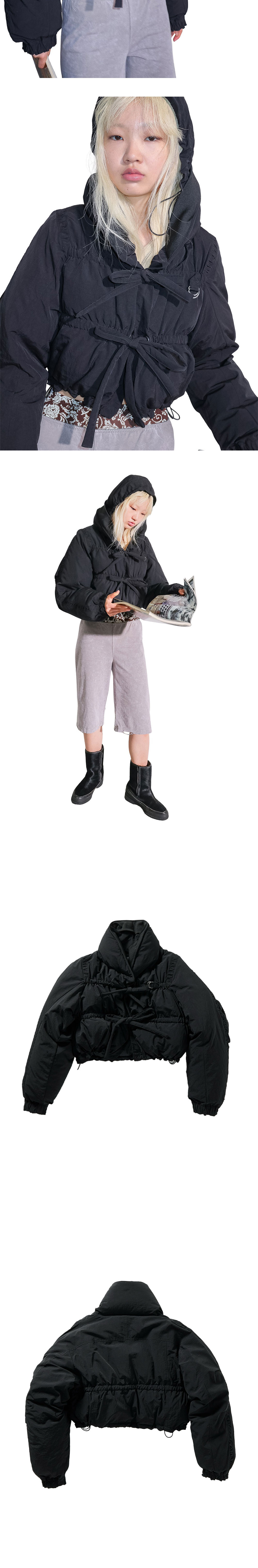 퍼버즈 우먼 스트링 멀티플 미니 다운 자켓 블랙입니다. - 크롭 기장의 다운 자켓 - 후드 내장형 디자인으로 실용성 강화 - 후드와 밑단의 엘라스틱 스트링으로 핏 조절 가능 - 앞여밈 스트링과 D링으로 다양한 실루엣 연출 - 양사이드 심 포켓 디테일