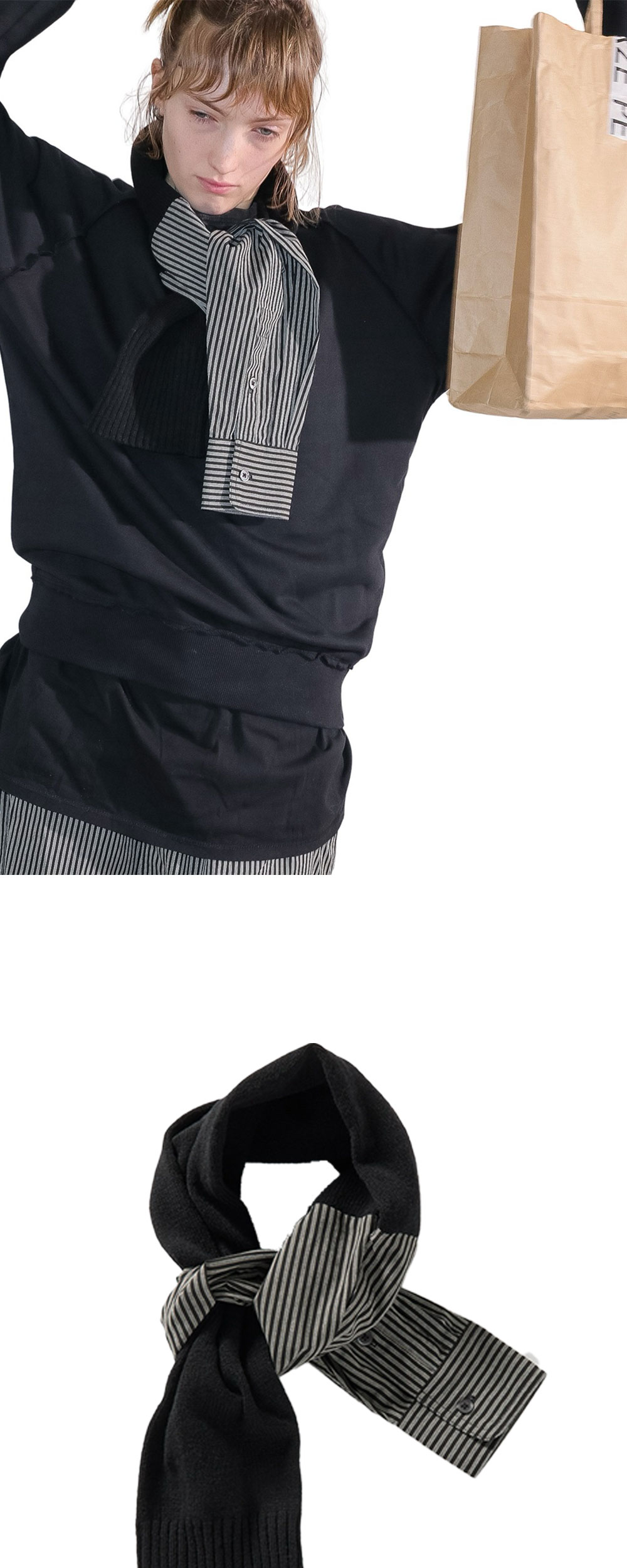 스트라이프 자카드 패브릭과 니트가 조합된 퍼버즈 우먼 더블 슬리브 스카프 블랙입니다. - 니트 슬리브와 셔츠 슬리브를 결합한 유니크한 디자인 - 소프트 터치 램스울 원사 사용으로 부드러운 착용감 - 스트라이프 자카드 패브릭으로 모던한 포인트 연출