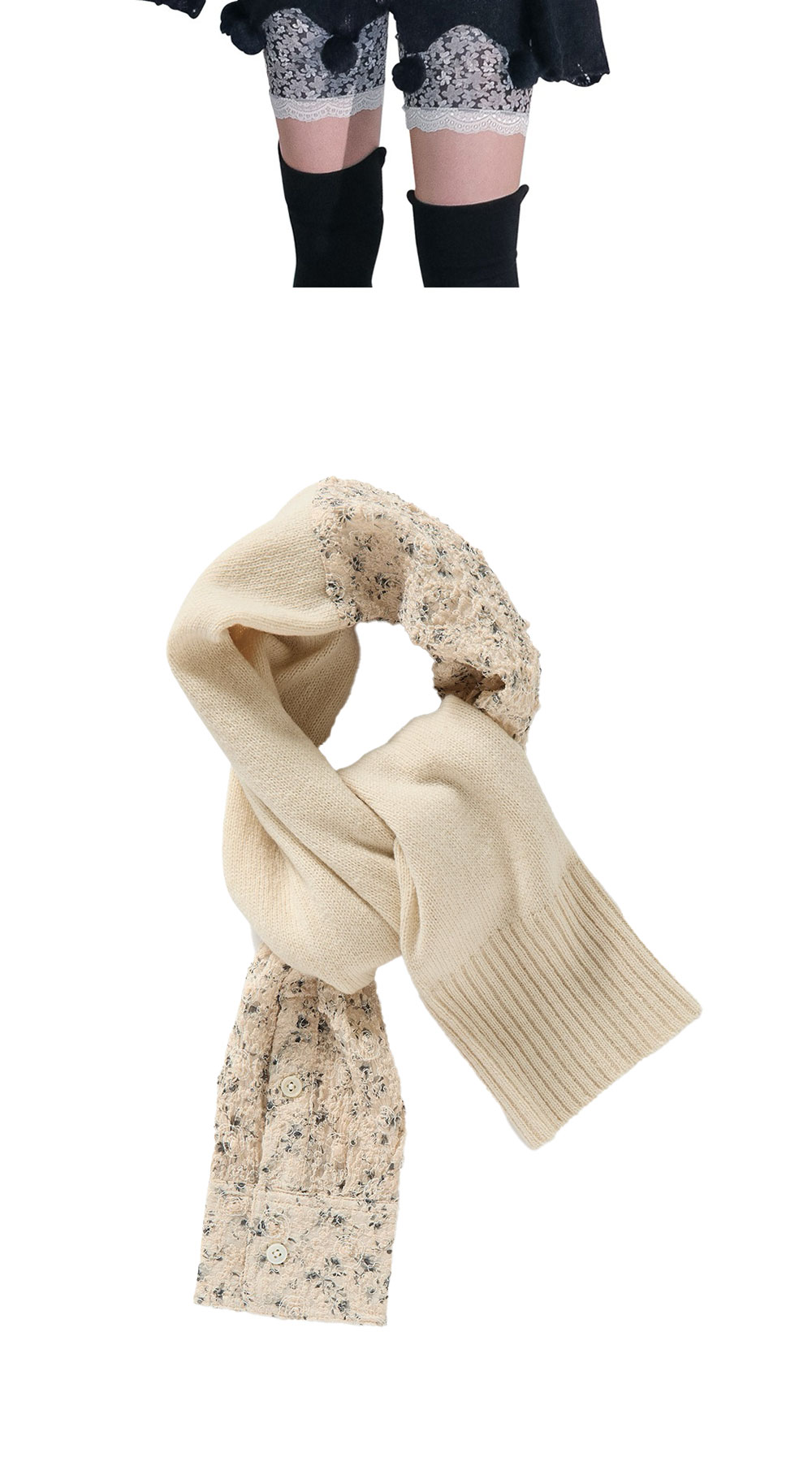 플로럴 패브릭과 니트가 조합된 디자인이 돋보이는 퍼버즈 우먼 더블 슬리브 스카프 베이지입니다. - 셔츠 슬리브와 니트 슬리브를 결합한 유니크한 디자인 - 소프트 터치 램스울 원사 사용으로 부드러운 착용감 - 플로럴 패브릭과 슈링크 스티치 디테일로 로맨틱한 무드 연출