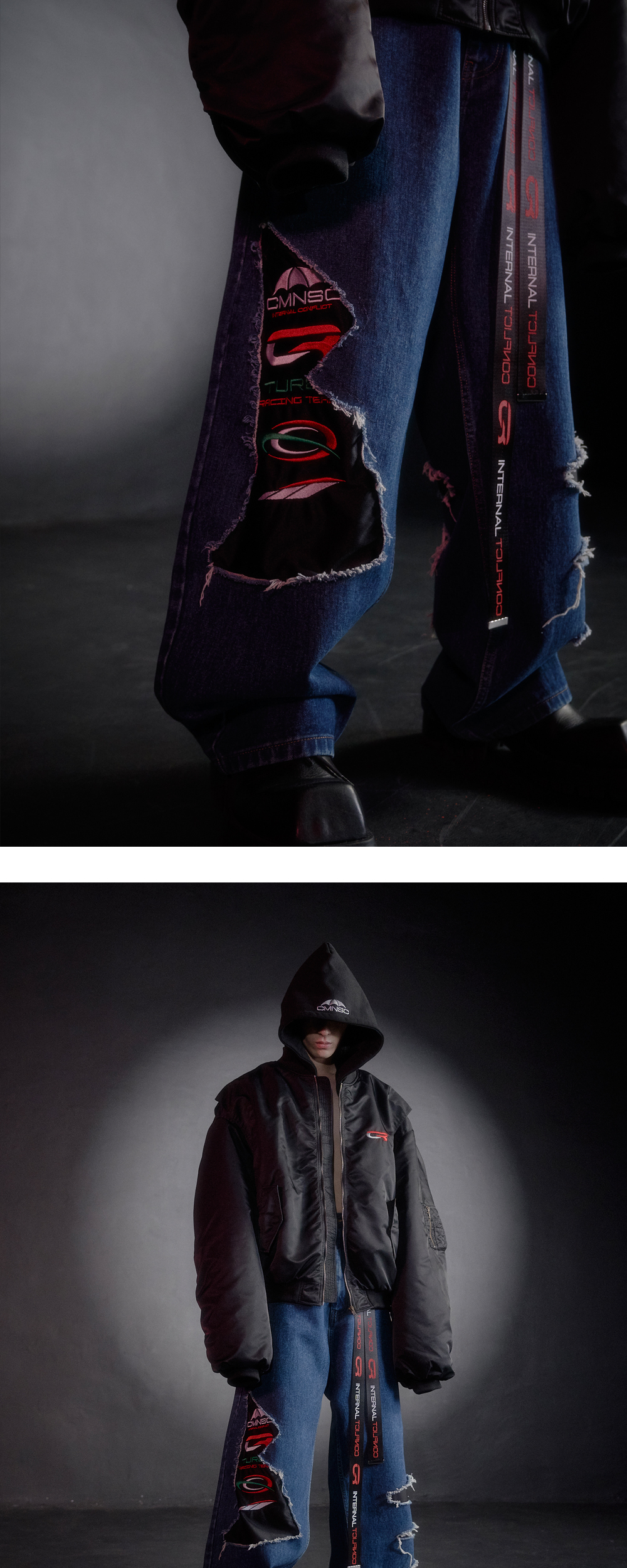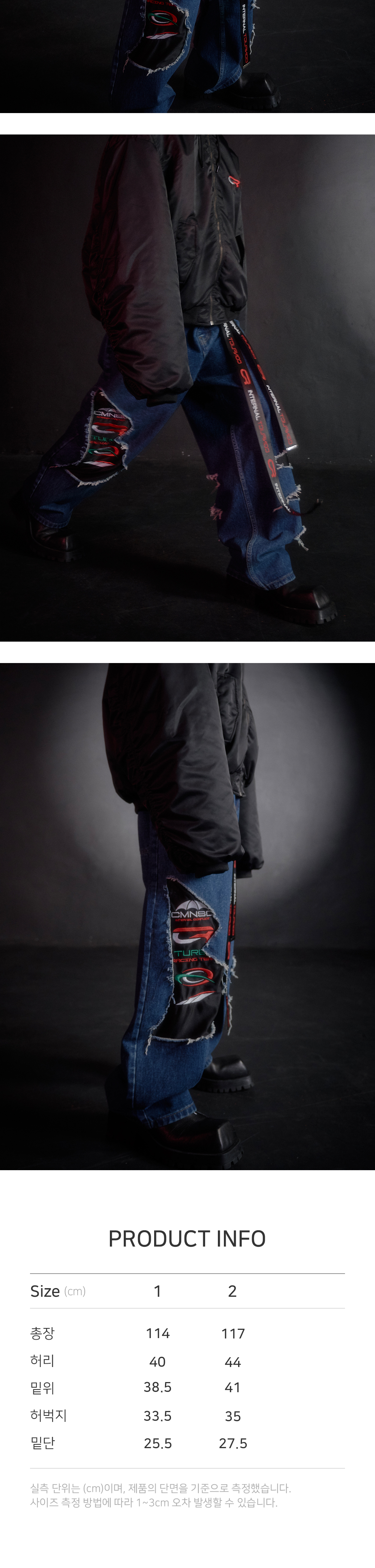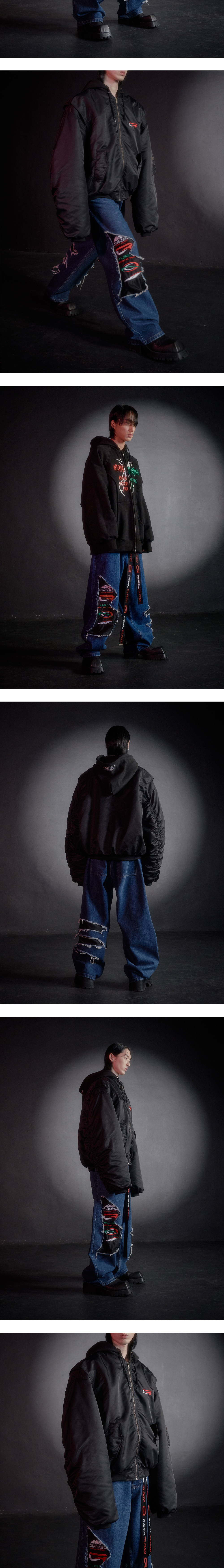 [PRODUCT INFORMATION] 제조국: 한국 소재: 코튼 100% 소재2: 폴리에스터 100% -디스트레스드, 페이드 이펙트 -레이싱 로고 자수 패널 -컷아웃 디테일 -시즌 슬로건 버튼 -허리 사이즈 조절 비조 -두개의 슬래쉬 포켓과 두개의 패치포켓 [Model Spec & Size] Man model is 181cm, and wearing a size 2