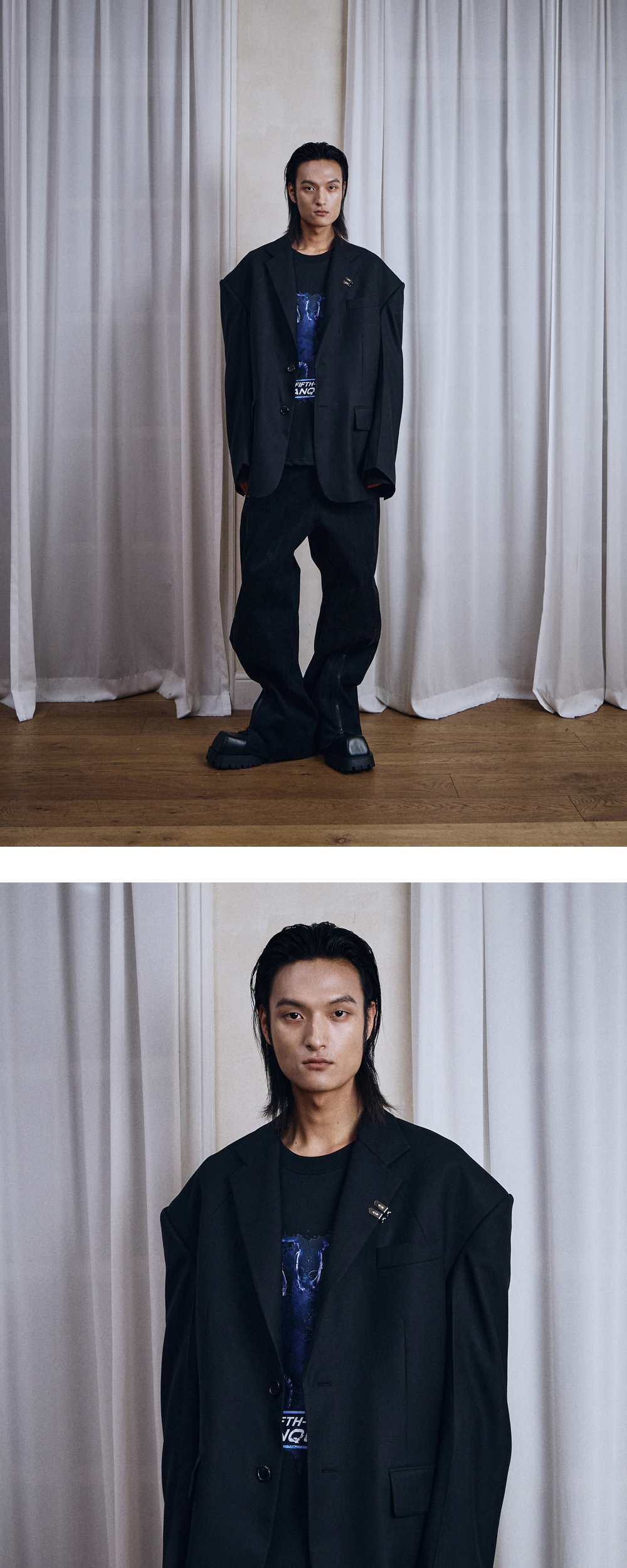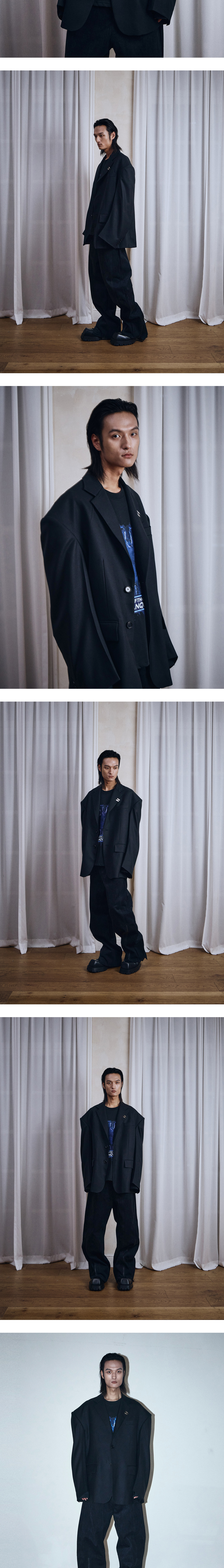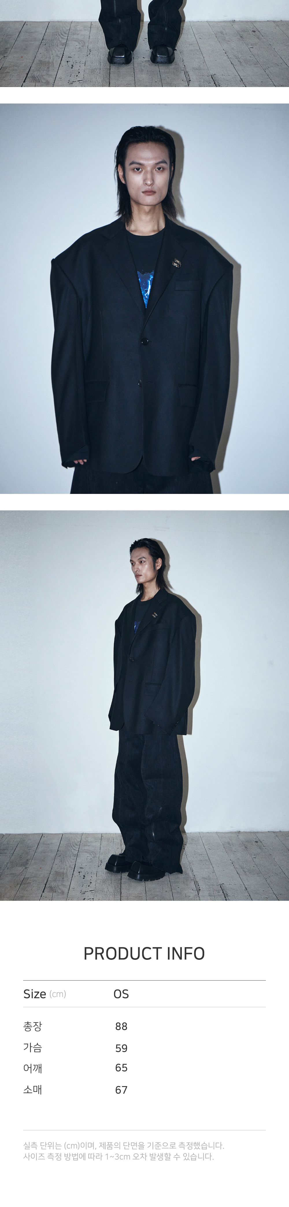 [PRODUCT INFORMATION] 제조국: 한국 소재: 울 92%, 스판 8% 소재2: 폴리에스터 52%, 비스코스레이온 48% -오버사이즈 실루엣 -두개의 금속 로고 장식 -바이커 소매 실루엣 -싱글 노치드 라펠 -투버튼 잠금 -두개의 플랩 포켓과 체스트 포켓 [Model Spec & Size] Man model is 185cm, and wearing a OS size