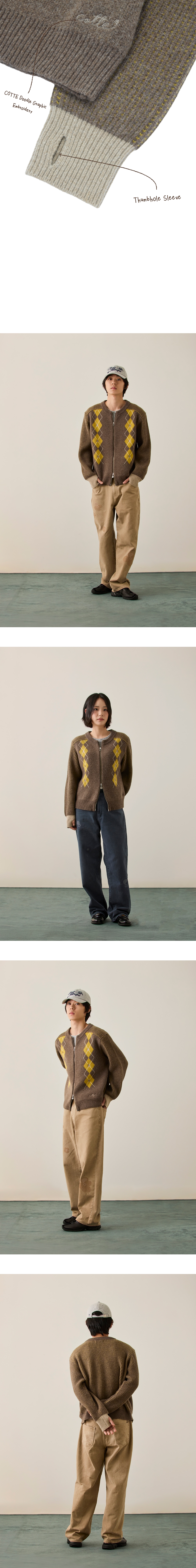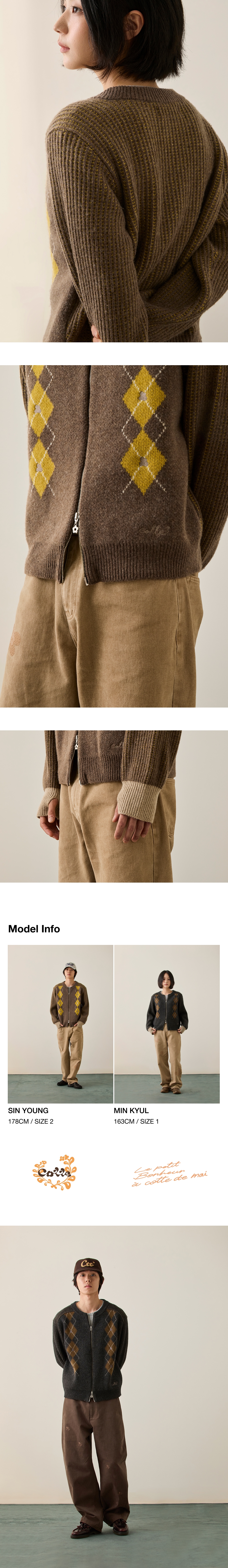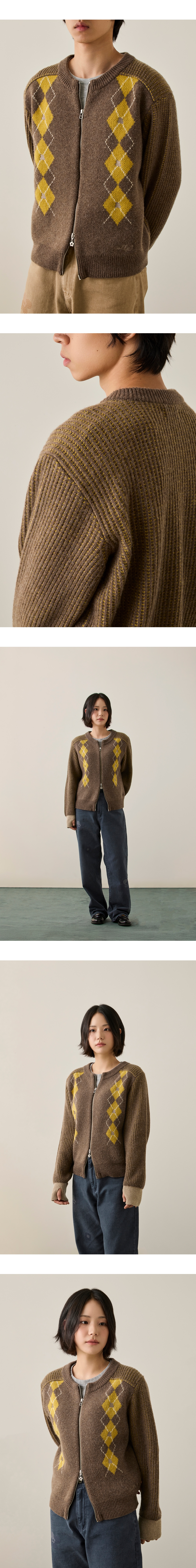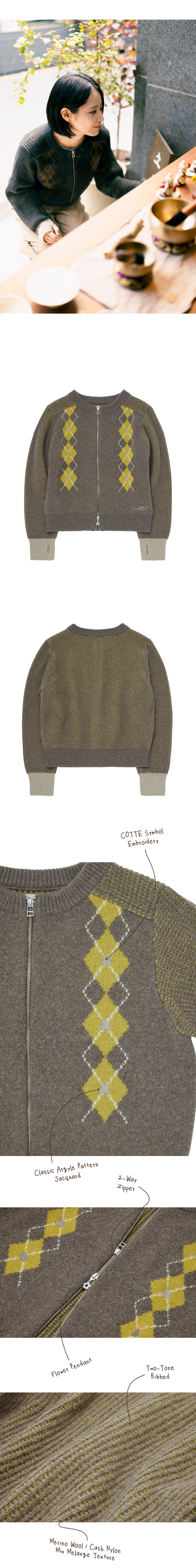 COTTE Argyle Twotone Ribbed Zipup Knit Brown