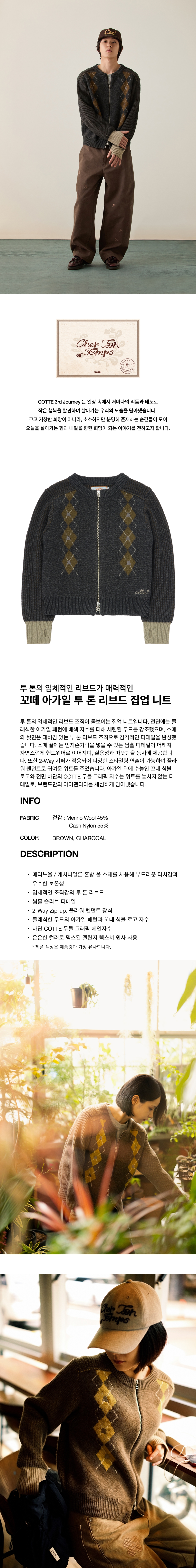 꼬떼 아가일 투 톤 리브드 집업 니트 차콜