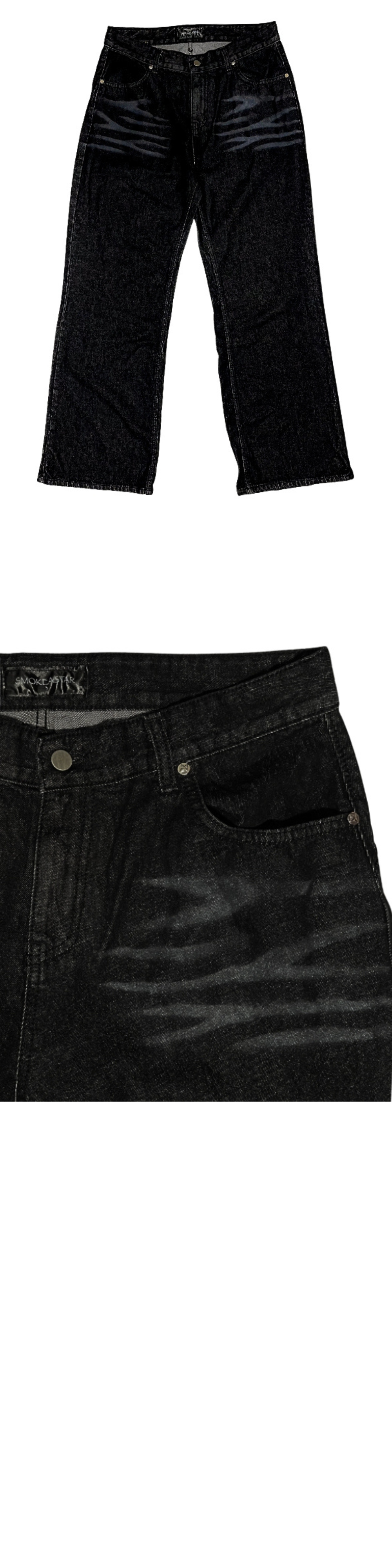 -자체제작 SMOKEASTAR 로고 캔톤 버튼 - 자체제작 SMOKEASTAR 가죽 라벨 -후면 가운데 열고 닫을 수 있는 벨트 룹스 디테일 -전면 팬츠 주머니 아래 위스커즈 워싱 -별을 수놓은 듯한 리벳 버튼들 -P41N(흉터)단어를 Leetspeak로 재해석한 나염 프린팅