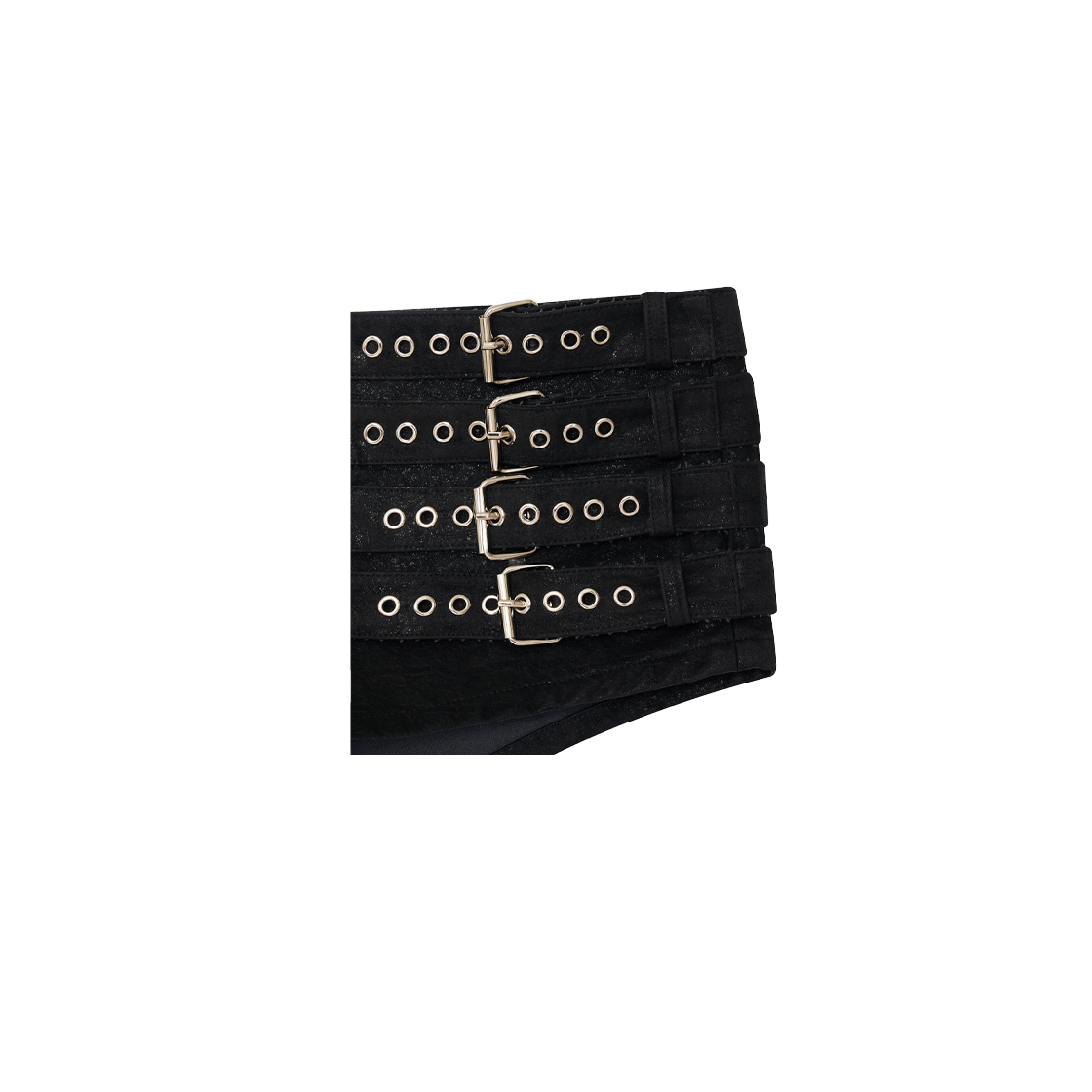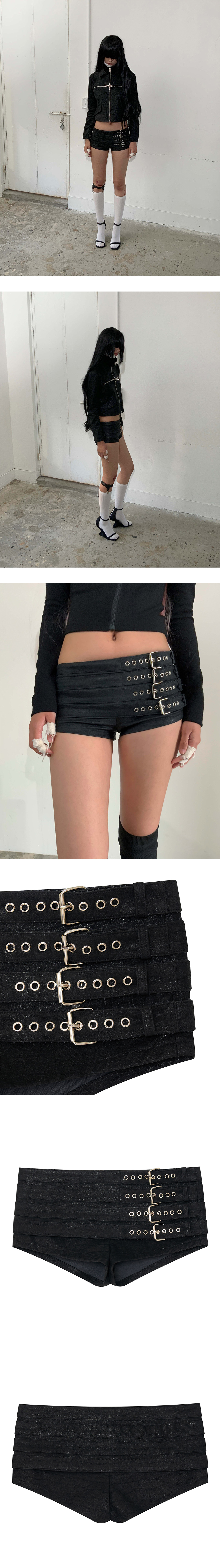 마이크로 기장의 쇼트 팬츠 팬츠 위에 벨트 스커트가 레이어드된 두 겹 디자인 사이즈 조절 가능한 4개의 벨트 디테일 사이드 YKK 콘솔 지퍼 내장 크랙 텍스처, 은은한 광택의 부드러운 합성 레더 Size(Length/Waist/Hip/Thigh/Crotch) 1 : 17.5cm/39cm/43.5cm/27.5cm/25cm 2 : 18.5cm/41cm/46cm/28.5cm/26cm 3 : 19.5cm/44cm/48.5cm/29.5cm/27cm Polyurethane 50% Polyester 50%