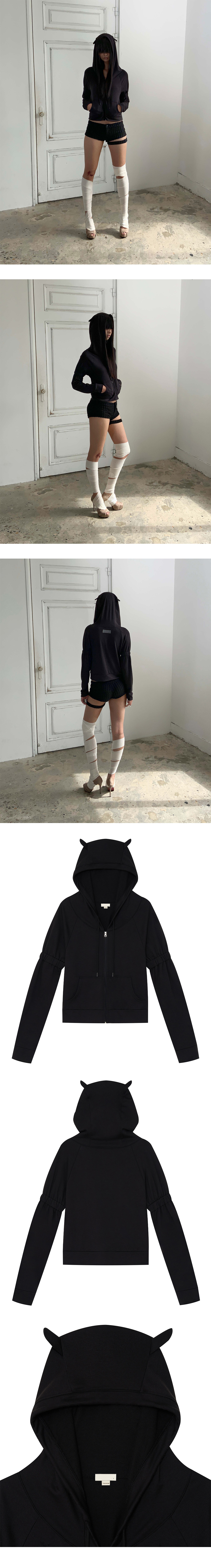 귀 모양 디테일의 후드 집업 보닝 와이어 내장으로 귀 형태 유지 가능 소매 셔링 밴드 디테일 후면 고무 패치 디테일 앞 포켓 디테일 부드럽고 가벼운 착용감 Size(Length/Shoulder/Chest/Sleeve) 1 : 50cm/36cm/44cm/64cm 2 : 51cm/37cm/46cm/65cm Polyester 62% Rayon 34% Spandex 4%