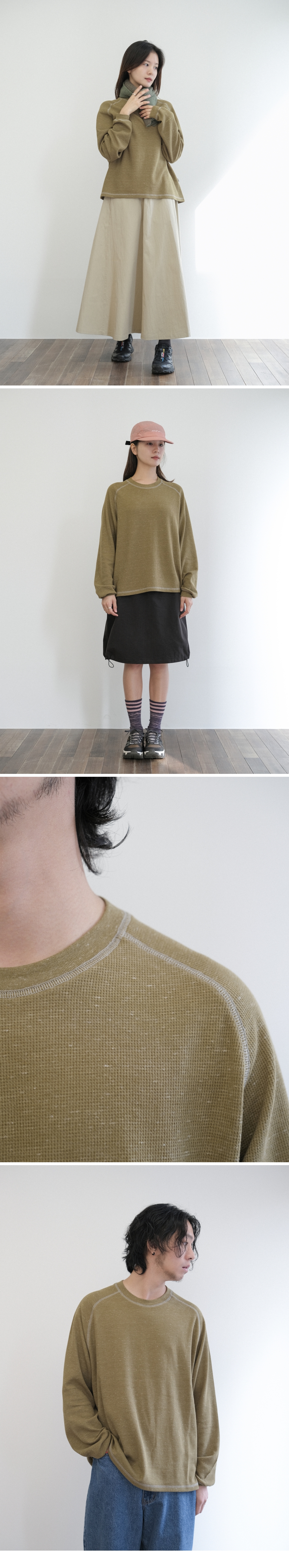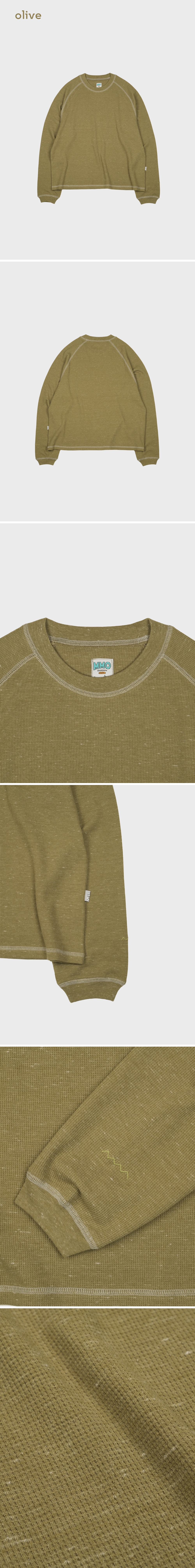 - 면과 폴리에스터가 블렌딩된 슬럽 텍스처의 내추럴 와플 원단 - 부드럽고 유연한 착용감으로 구김이 적고 형태가 자연스럽게 유지됨 - 통기성과 흡수성이 좋으며, 미세한 사각 패턴이 공기층을 만들어 포근한 온기를 유지함 - 봉제선에 배색 실을 더해 스티치로 포인트 완성 색상 올리브 소재 면 60%, 폴리에스테르 40% 사이즈 (cm) 1: 총장 61 / 가슴폭 54 / 밑단폭 54 / 소매장(레글런) 75 2: 총장 64 / 가슴폭 57 / 밑단폭 57 / 소매장(레글런) 77 3: 총장 71 / 가슴폭 61 / 밑단폭 61 / 소매장(레글런) 81