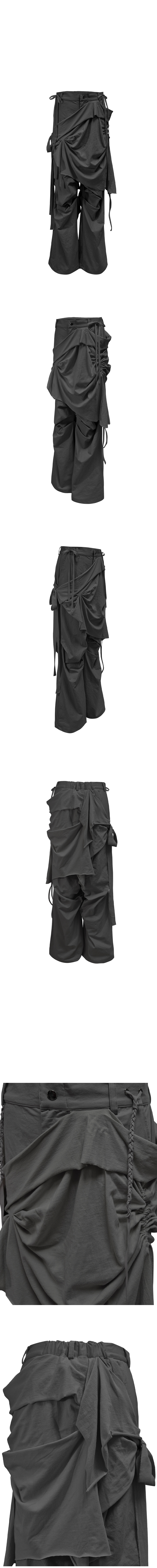 레이어링 바이 팬츠 - 유니섹스 착용이 가능한 와이드 핏 - 무릎 턱 디테일 - 스트링을 이용한 셔링 디테일 - 사이드 스트랩을 이용한 다양한 스타일링 - 스커트 앞면, 후면 게더링 디테일 - 허리밴딩과 사이즈 조절이 가능한 스트링