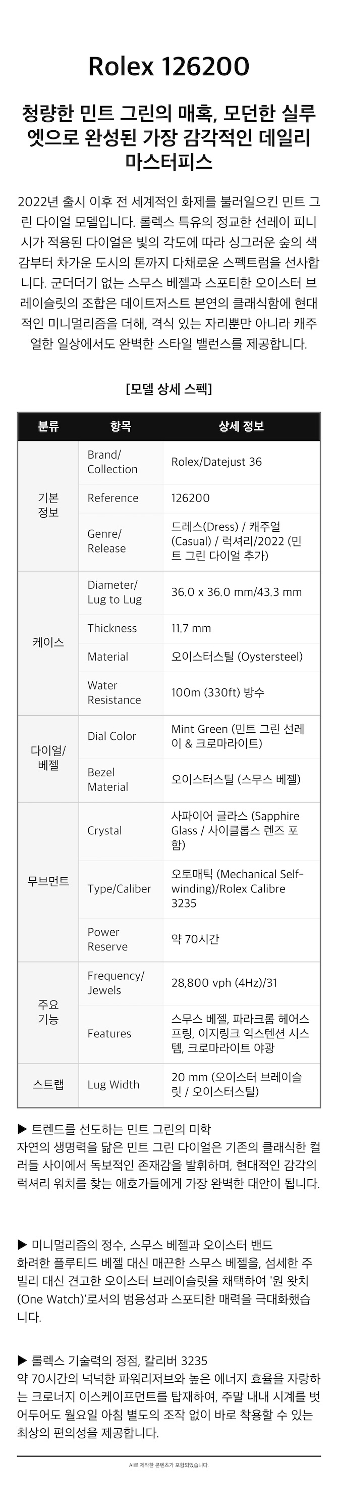 롤렉스 데이트저스트 36mm 126200 민트 그린 오이스터