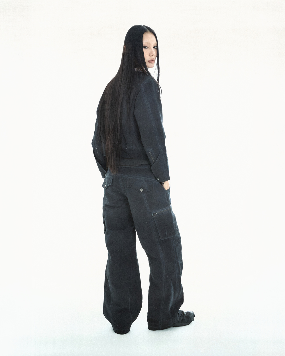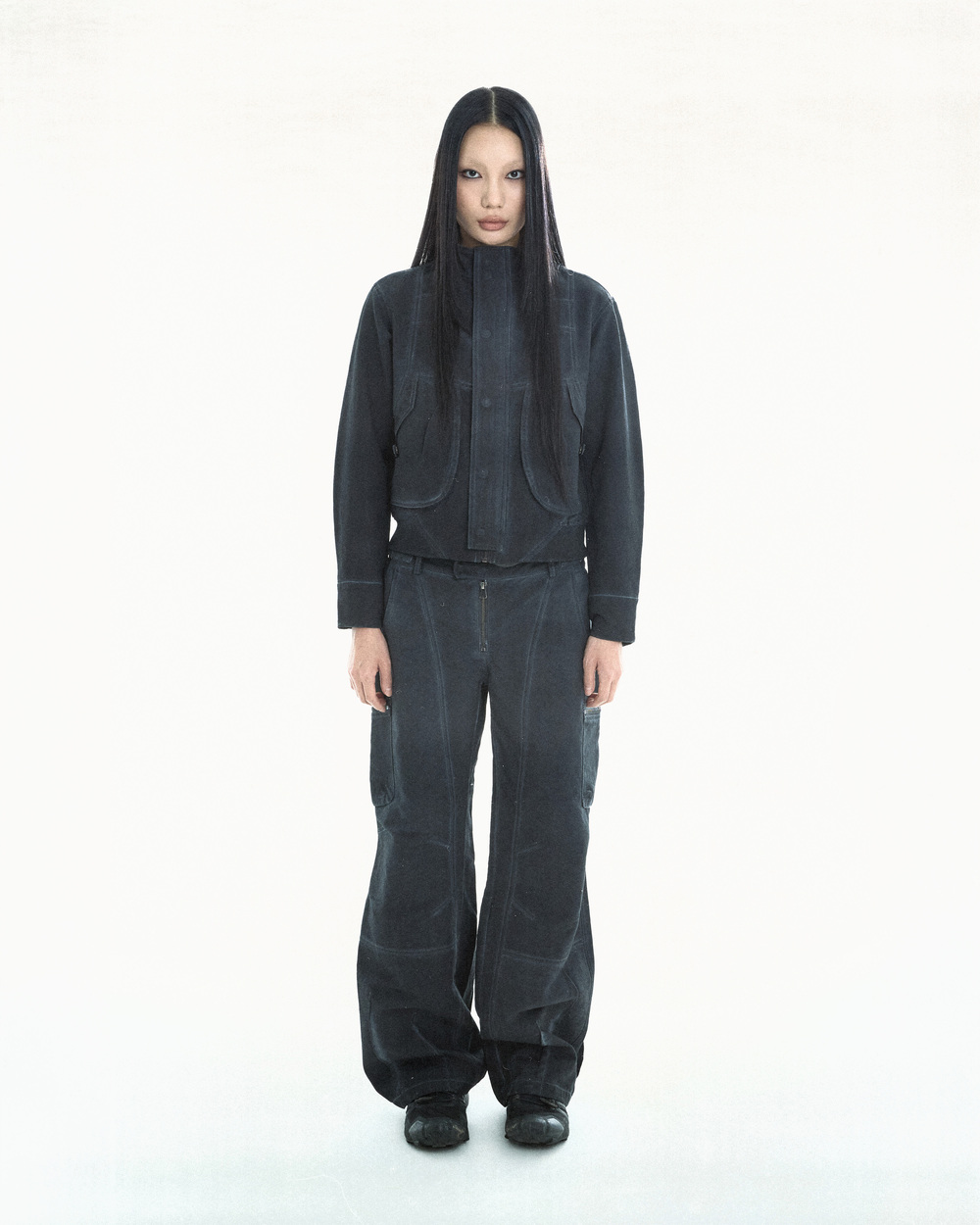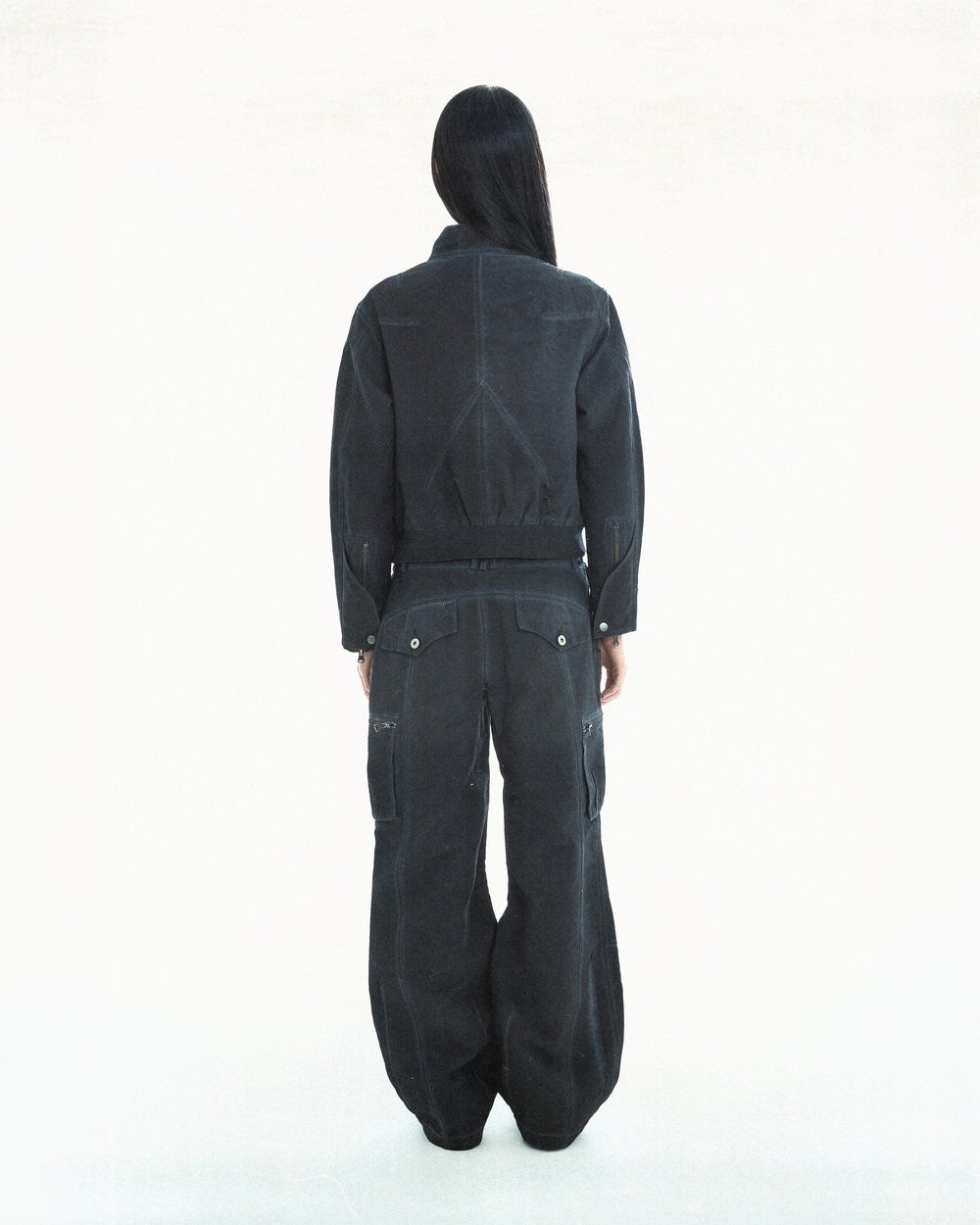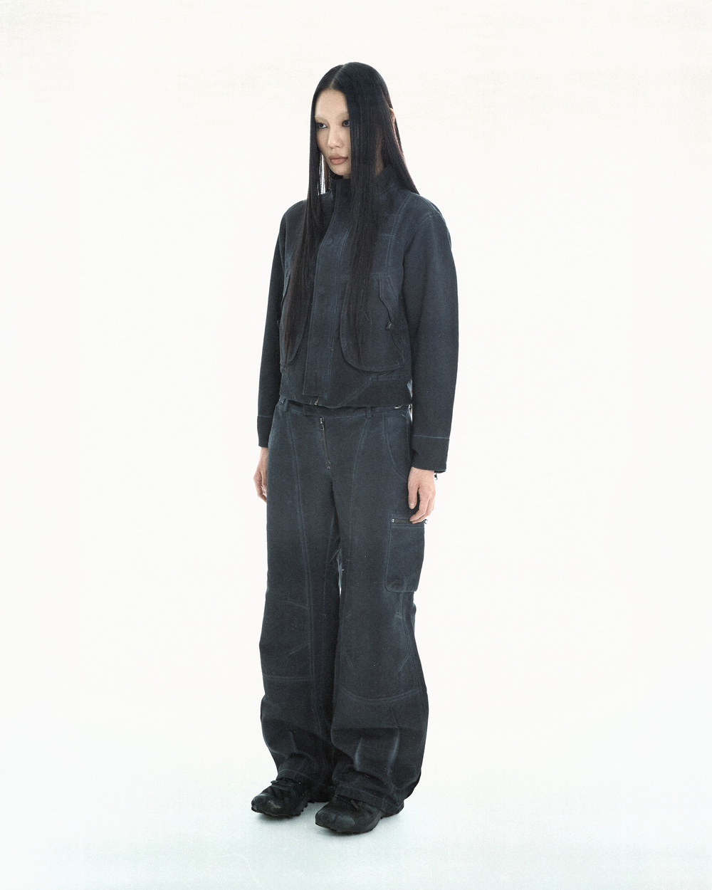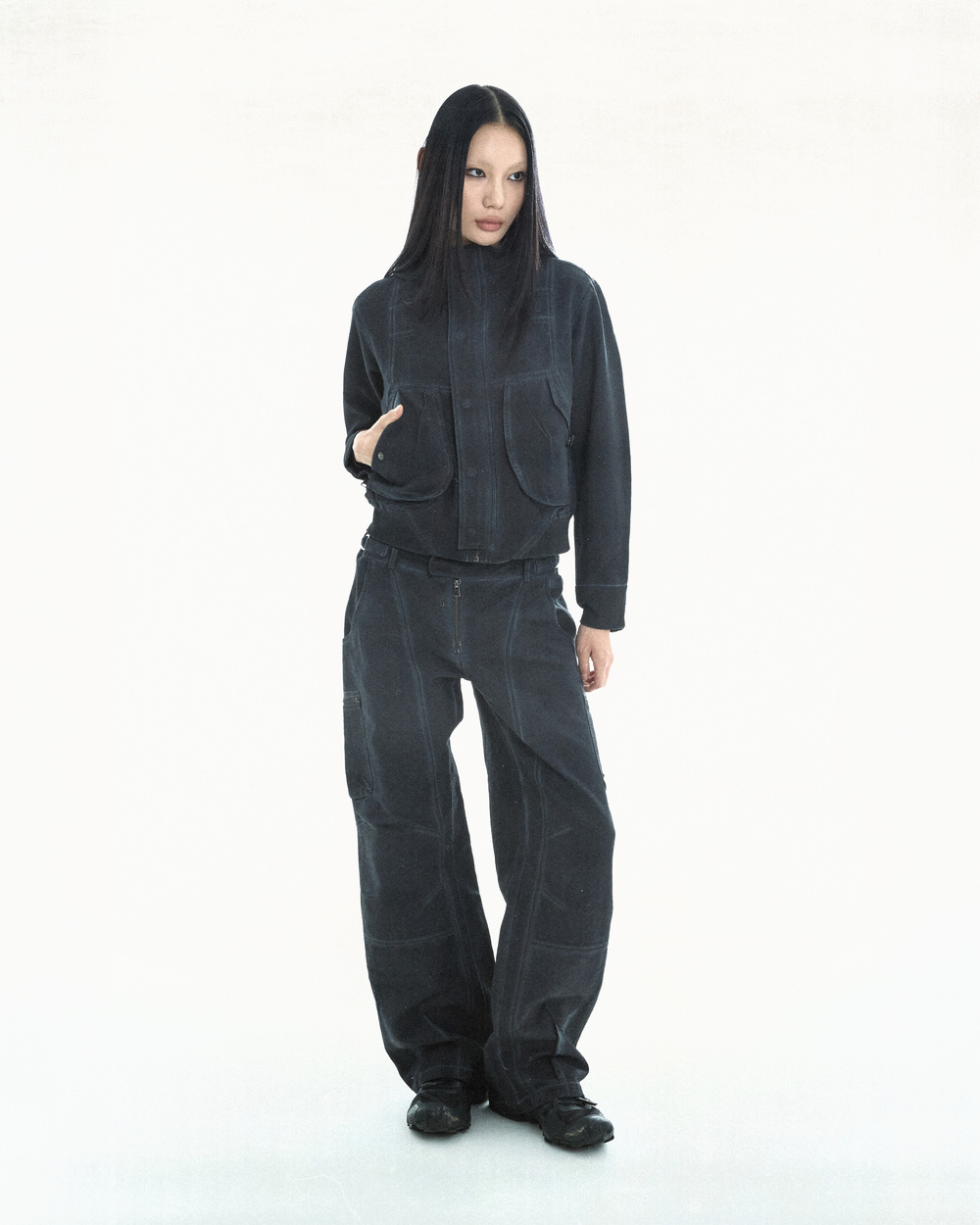 독자적인 루나 워싱 기법으로 구현된 입체적 텍스처, 시보리에는 니트 립 원단을 적용, 2-way 커프스 디테일로 둘레 조절이 가능하며 다양한 실루엣 연출, 다트 부분에 사각 스티치 장식으로 포인트를 연출, 비죠와 스냅으로 고정된 구조적 프론트 포켓