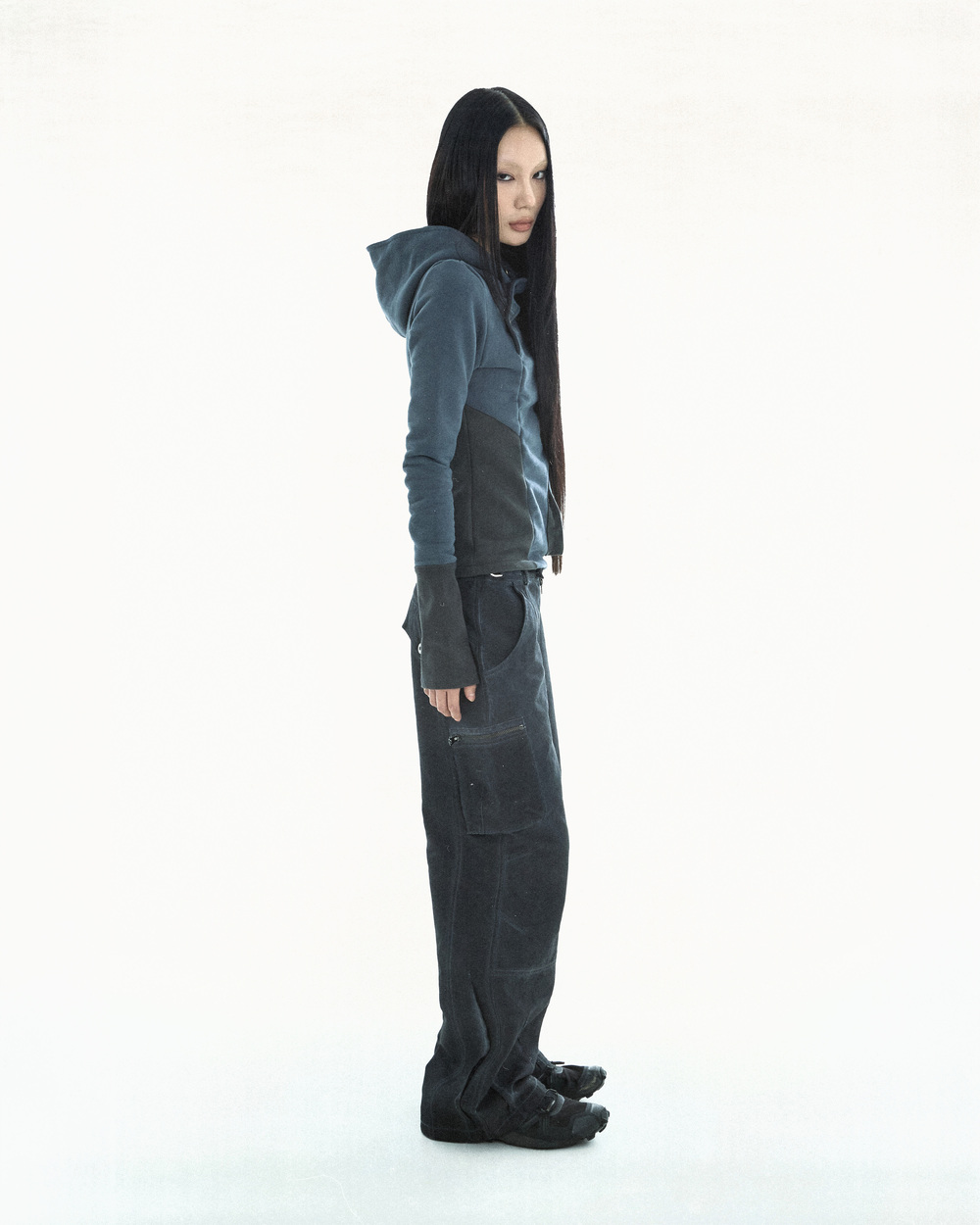 피치 워싱 원단 사용, 넥 라인에 곡선 형태로 배열된 캔톤 디테일, 후드 안감에 이질적인 텍스처의 원단 사용, 구조적으로 배치된 프론트 포켓 디테일, 커프스 립 원단 사용
