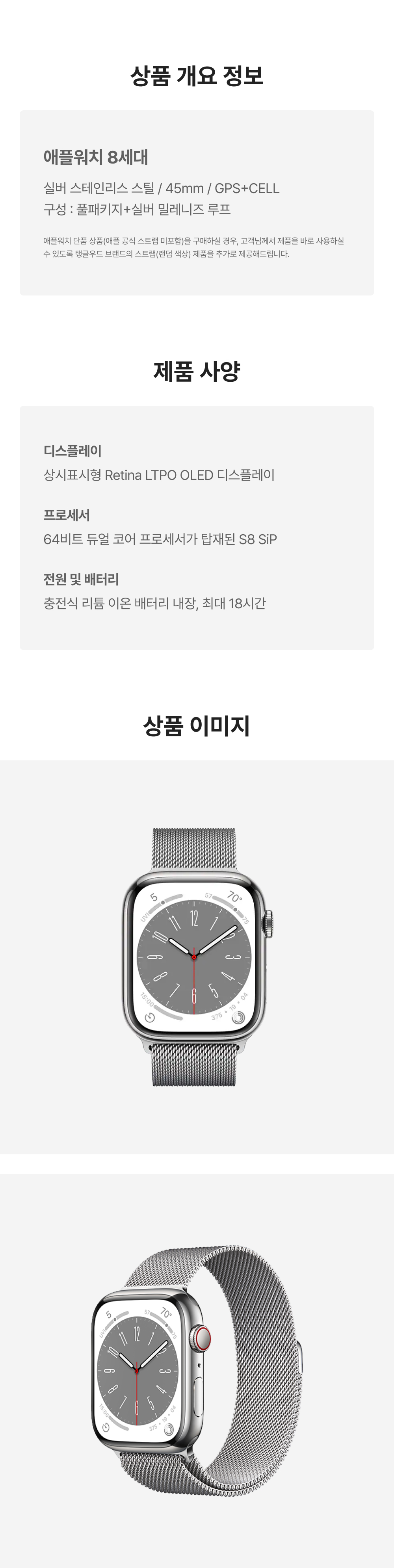 [B등급] 리퍼비시 애플워치 8 45mm 셀룰러 실버 스테인리스 스틸 케이스 밀레니즈 루프 실버