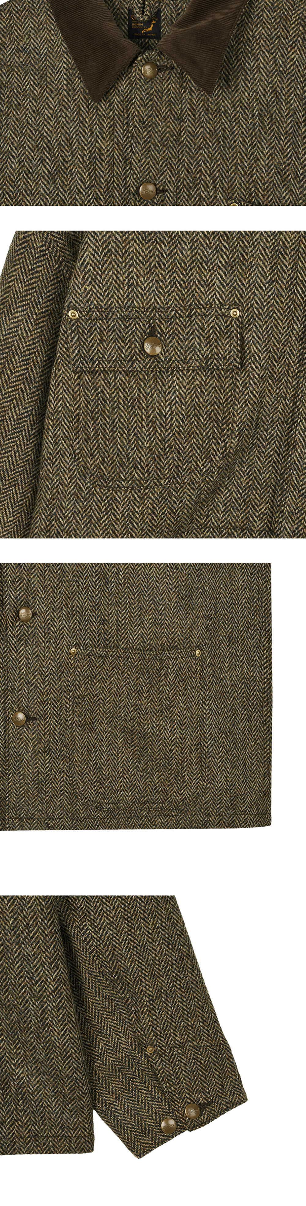 오어슬로우 해리스 트위드 릴렉스 핏 커버올 카키입니다. - 빈티지한 질감의 정통 해리스 트위드 울 - 군용 재킷의 견고함과 편안하고 루즈한 핏을 결합 - 코듀로이 안감 처리된 칼라와 커프스 - 황동 단추 여밈과 앞면에 4개의 포켓