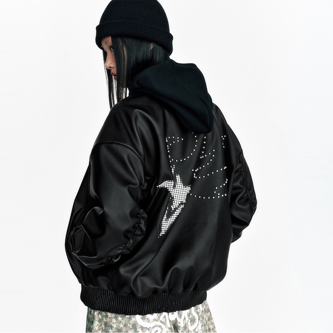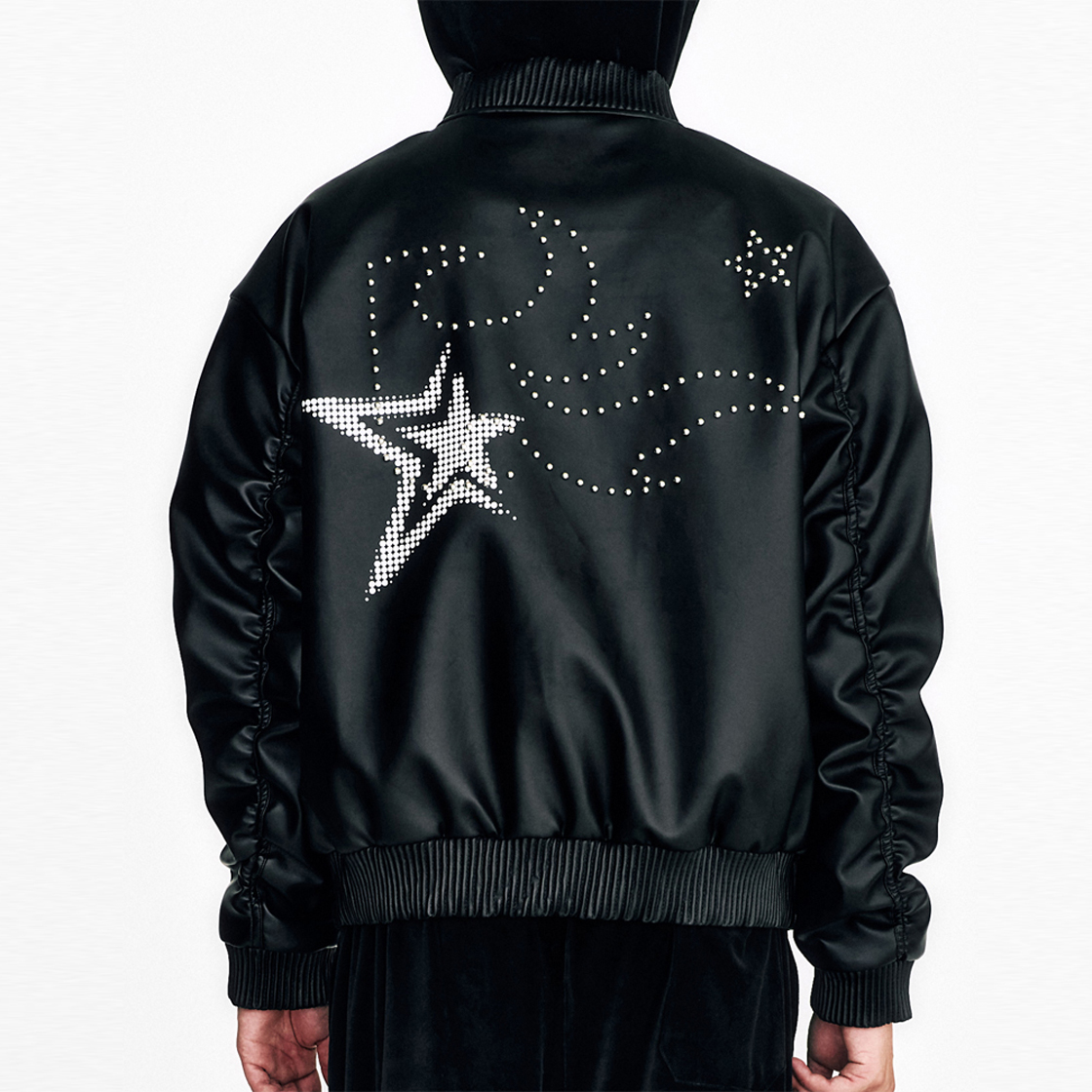 비건 레더 항공점퍼로 앞뒤판 스터드 디테일이 있고, 소매에 주름을 잡아 완성된 핏을 연출합니다.