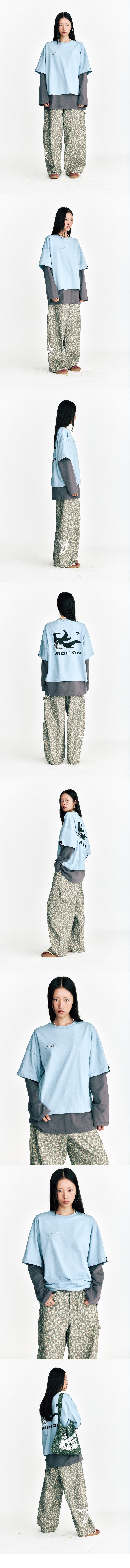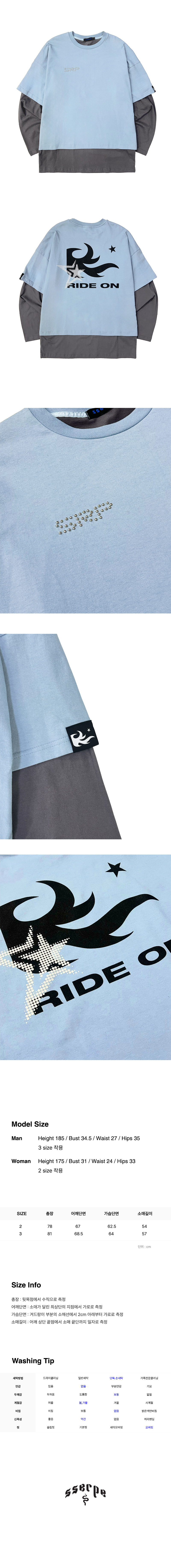 배색 레이어드 티셔츠입니다. 스터드와 그래픽 나염, 소매에 포인트 라벨 디테일로 하나의 옷으로 완성된 스타일링이 가능합니다.