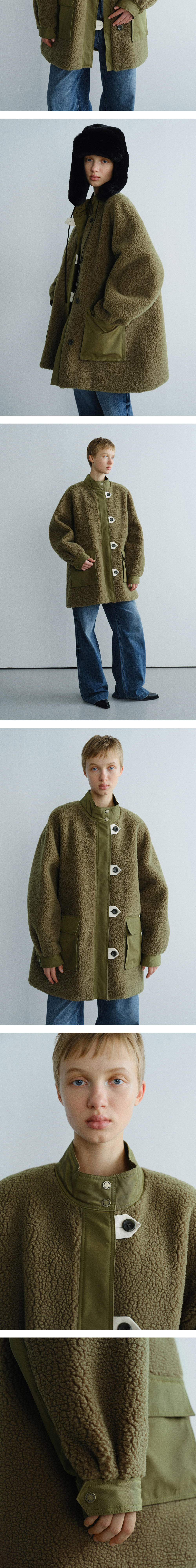 - A라인 실루엣의 오버사이즈 핏으로 제작된 플리스 하프 코트입니다. - 나일론 소재의 컬러 블록과 빅 사이즈 아웃포켓 디테일이 더해져 캐주얼한 스타일링을 완성할 수 있습니다. - 겉감은 울 혼용 소재를 사용하여 고급스러운 질감을 살렸으며, 안감에는 1온스 본딩 처리를 더해 뛰어난 보온성을 제공하며 겨울 시즌에도 따뜻하고 편안하게 착용할 수 있는 아이템입니다. - 넥 부분에는 수입 스냅 버튼을 사용하고, 앞 여밈은 플래킷과 테이프 단추 여밈으로 마감하여 디테일 하나하나까지 고급스럽게 완성했습니다.